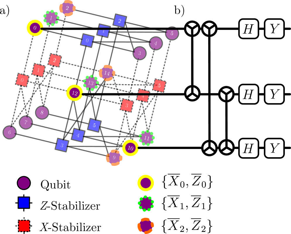 Код поверхностной коррекции ошибок, основанный на графе Таннера для конфигурации ⟦15,3,3⟧, демонстрирует взаимосвязанные копии кодов с d=2 и реализует логический гейт H посредством кругового обмена, включающего все-к-все взаимодействия Y и поперечные гейты H и YY на кубитах, поддерживающих логический оператор, что позволяет реализовать устойчивую к ошибкам логическую схему.