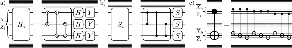 Целевые логические Клиффордовские гейты для кодов ind=3d=3LCS реализуются посредством все-к-все операций YCY для гейта H-overline, ZCZ для гейта S-overline и операций CX для внутриблочного гейта CiXj-overline, что демонстрирует специфическую структуру операций, необходимую для реализации этих гейтов в данной кодовой структуре.