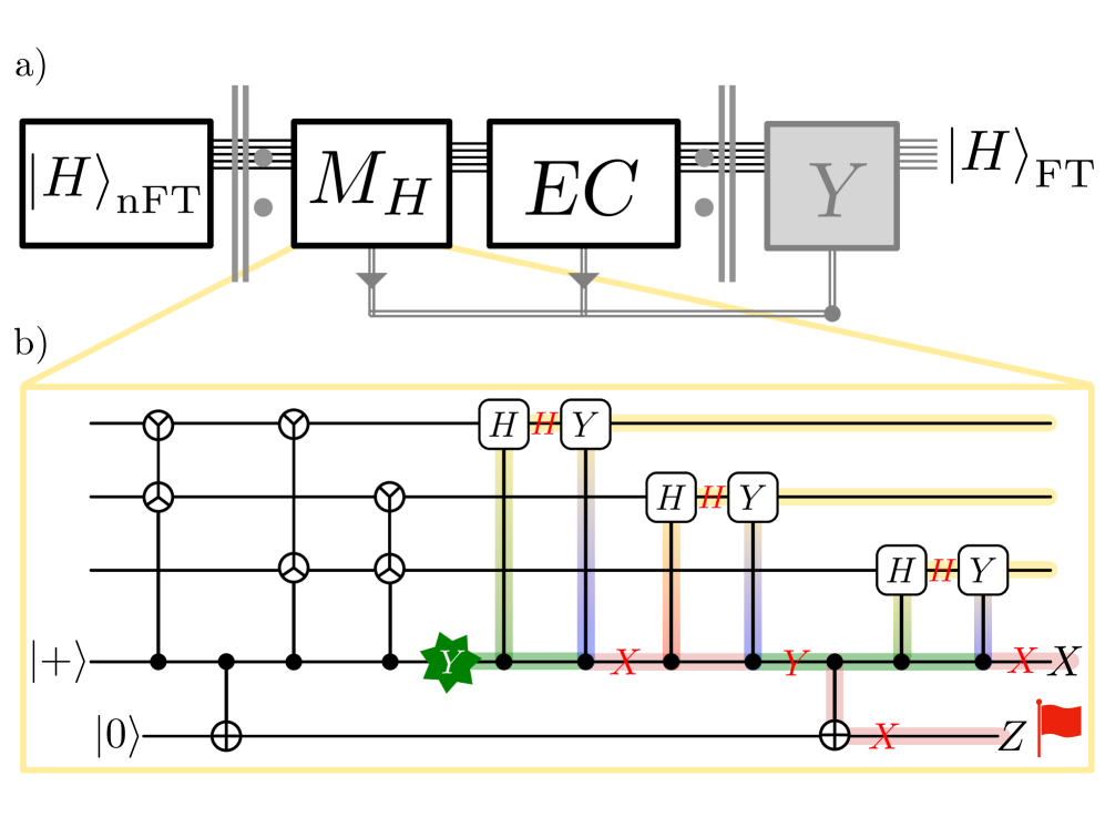 Разработана схема устойчивого к ошибкам приготовления магического состояния, использующая логические блоки для выполнения протокола как в детерминированном режиме, так и по принципу повторения до успеха, при этом для устойчивого приготовления одного магического состояния требуется повторение измерения логического оператора Адамара и коррекции квантовых ошибок до получения однозначно интерпретируемого результата, а в случае обнаружения ошибки применяется логический оператор YY-flip, при этом измерение целевого логического оператора Адамара на трех физических кубитах данных, поддерживающих логические операторы X̄ᵢ, Z̄ᵢ, использует вспомогательный кубит для обнаружения опасных ошибок, которые могут проявиться как логические XX или ZZ на кубитах данных, не изменяя состояние измерительного кубита.