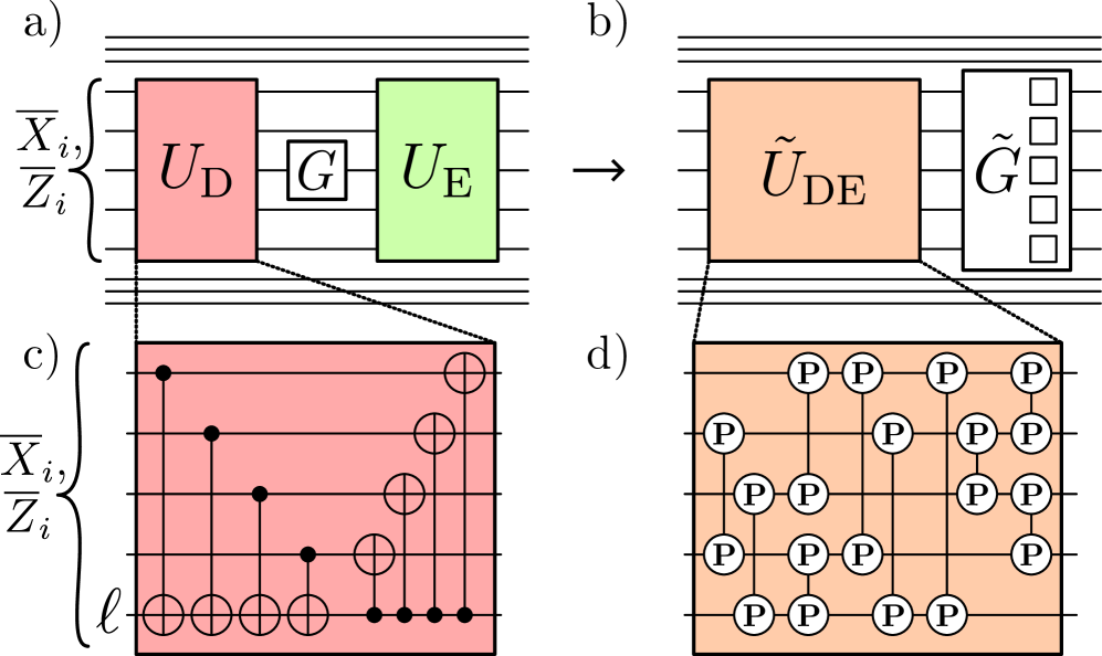 В конструкции круговых ворот используется декодирующая схема, отображающая логические кубиты на физические, за которой следует применение ворот и обратное кодирование, при этом критическим узлом является возможность распространения ошибок через эту схему. Для обхода этого ограничения ворота переносятся в конец схемы кодирования, что приводит к адаптированной схеме и преобразованным воротам, которые становятся трансверсальными для однокубитных клиффорд-ворот. Эффективной реализацией декодирующей схемы является использование вентилей CNOT, отображающих логические операторы на один физический кубит, а перенос однокубитных клиффорд-ворот через схему перекодирования приводит к схеме, состоящей из вентилей Pauli-controlled-Pauli, применяемых ко всем парам кубитов.