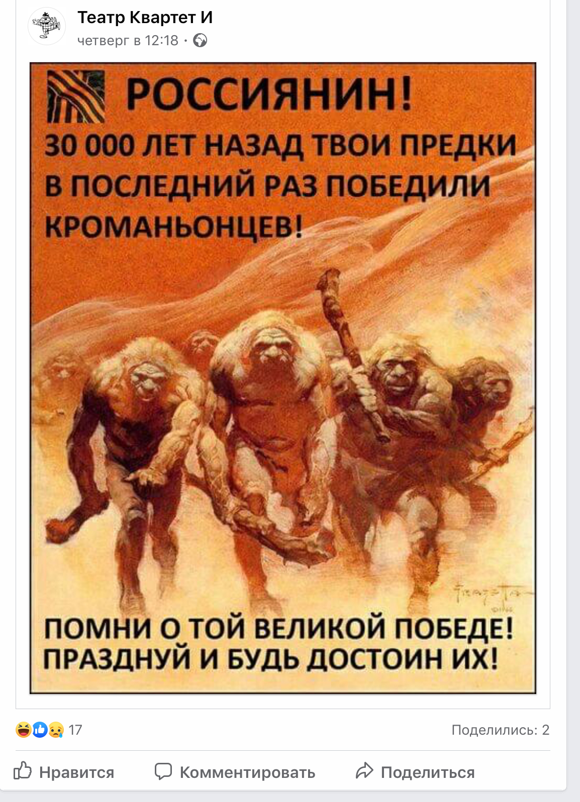 На прошлой неделе отдуплился всеми любимый Квартет И, известный нам по фильмам из цикла О чем говорят мужчины. Я тут даже избитых фраз говорить не буду о перспективах отдельных участников квартета в случае, если бы Победы не было, в силу того, что они евреи, это всем и так понятно. То ли ребята хайпануть решили, то ли smm у них мудак, но выложили они в свой фейсбук такую картинку