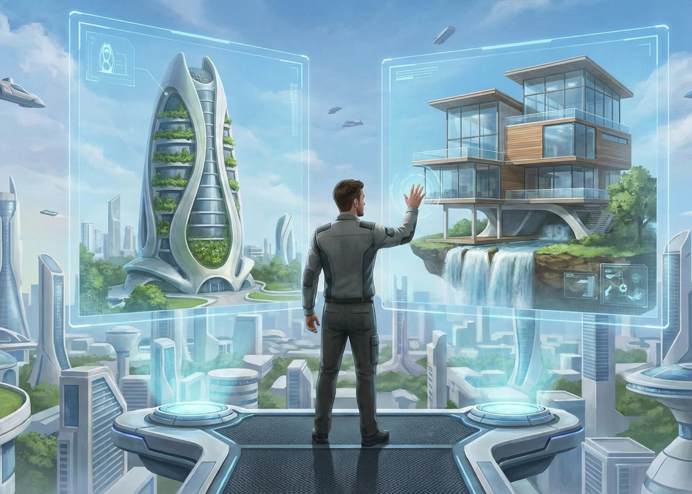 Дома из бетона в 2126 году не исчезнут, но трансформируются. В наши дни активно развиваются технологии дополненной реальности, которые со временем будут использовать для улучшения обстановки в квартире. Пространства обретут динамичность, а стены и мебель смогут менять форму и цвет в зависимости от желания жильца. Например, спальня станет рабочим кабинетом, кухня — просторной гостиной для встречи с друзьями. А чтобы сделать утреннюю зарядку, «умный дом» предложит площадку в Альпах.
