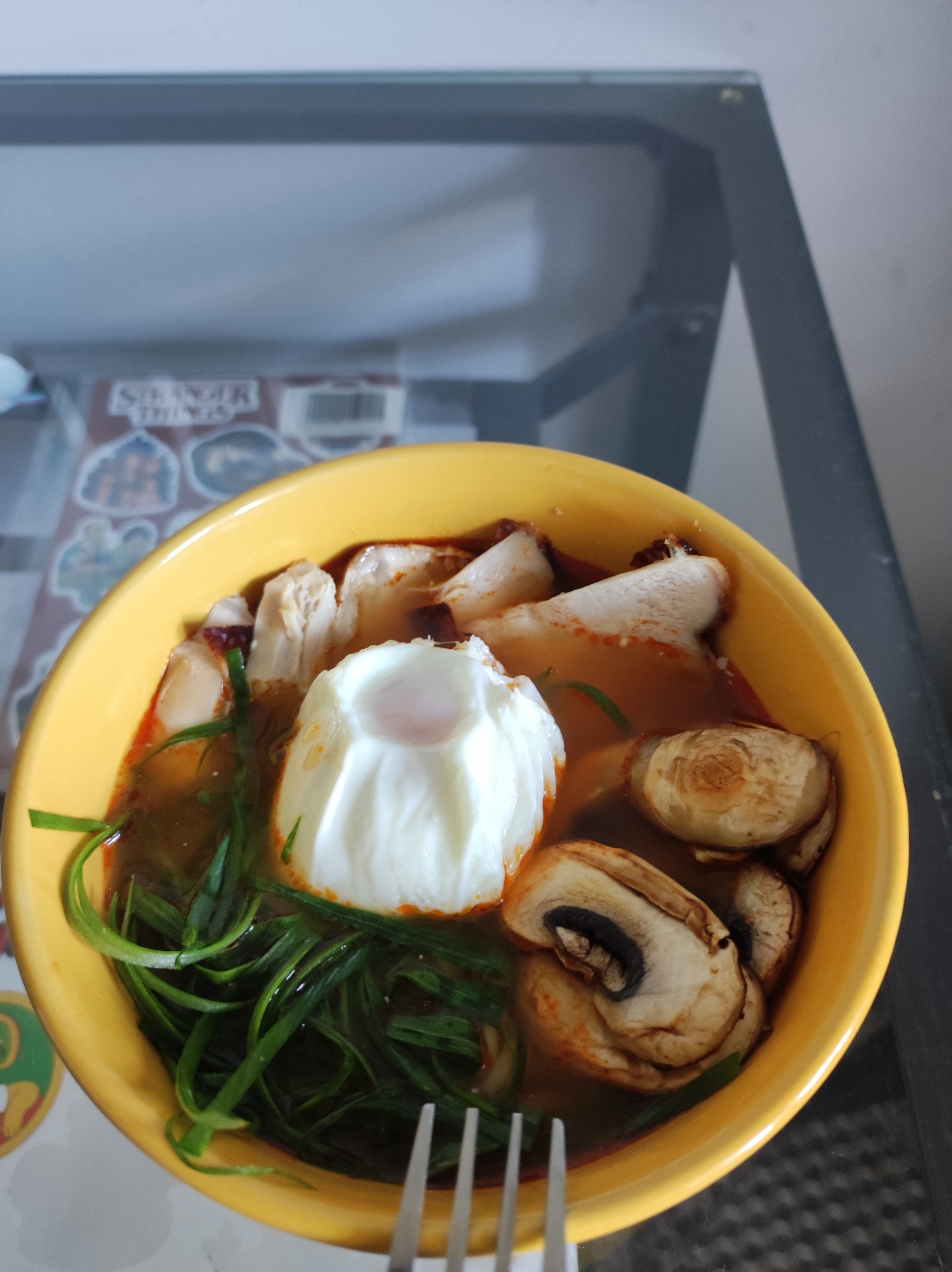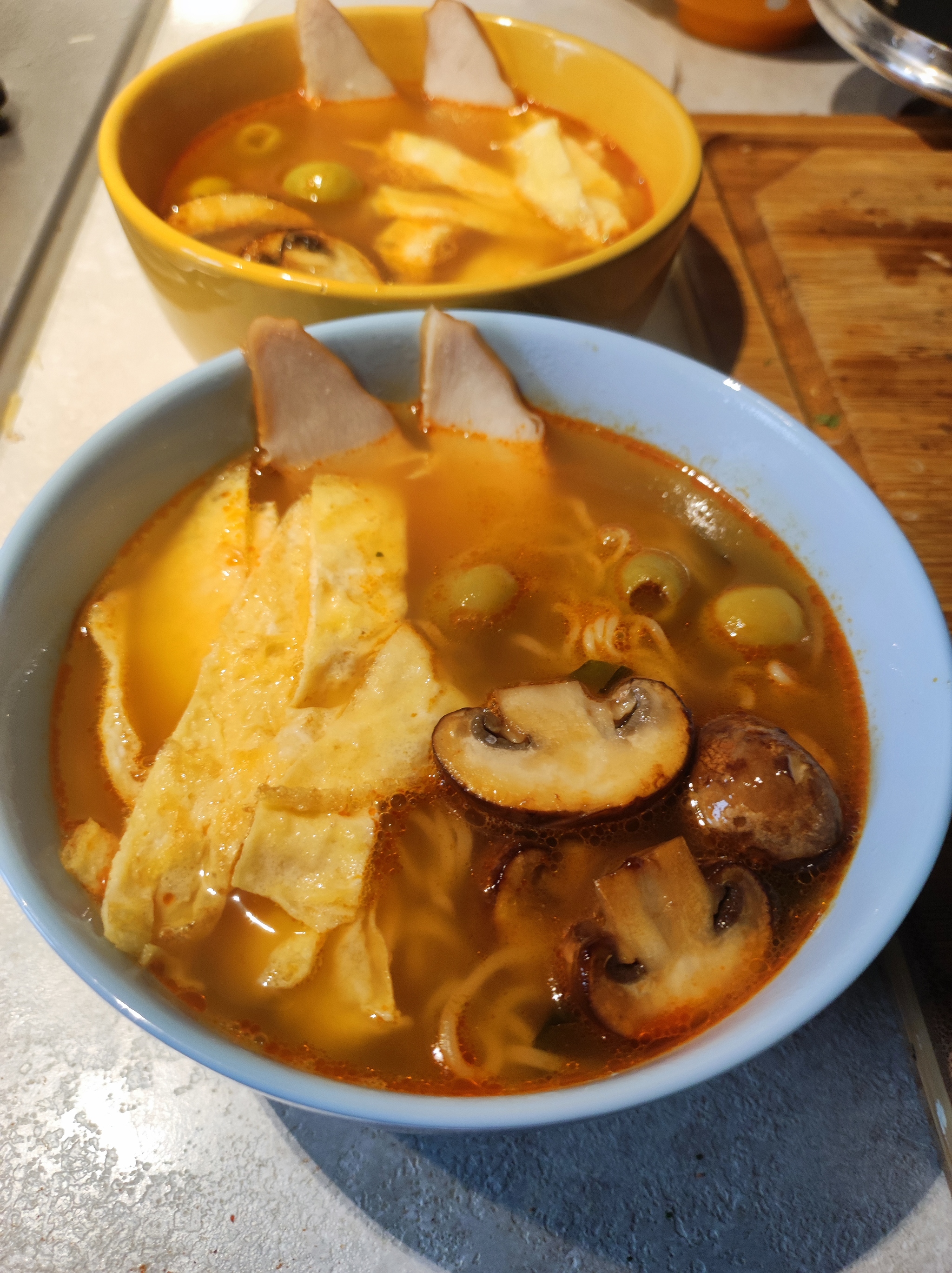 берем квисти от доширака(пачка лапши в пакетике, греем кастрюльку с водой, воду рассчитывайте на свой вкус, на две порции 600-700мл, в воду сыпем зелёную/красную приправу-бульон, если нравится остальное, то тоже туда же, добавляем дольку лимона/лайма, 3-4 колечка имбиря, если хочется острого, то перчик (чили/халапеньо), но чем дольше перчик варится, тем острее. Пока бульон закипает готовим допнички - яйцо, мясо, грибы, все по вкусу, как любите, так и делаете. Как вода закипела кидаем туда лапшу, варим 3-5 минут помешивая, пробуйте. Как лапша готова, распределяем ее по тарелкам, далее допнички, и заливаем бульоном. Лимон и имбирь лучше вынуть, такое они себе после варки. Сверху кинза и зелёный лук только усиливают вкус.