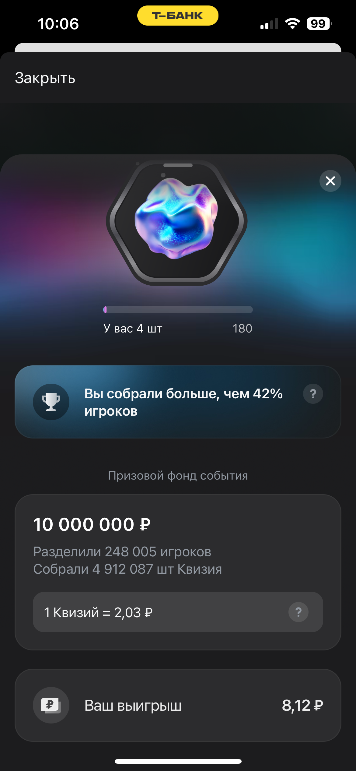 В приложении т-банка пиарили игру квизи. Розыгрыш был целых 10 миллионов среди участников. Жена активно участвовала и хочу поделится результатами выигрыша.