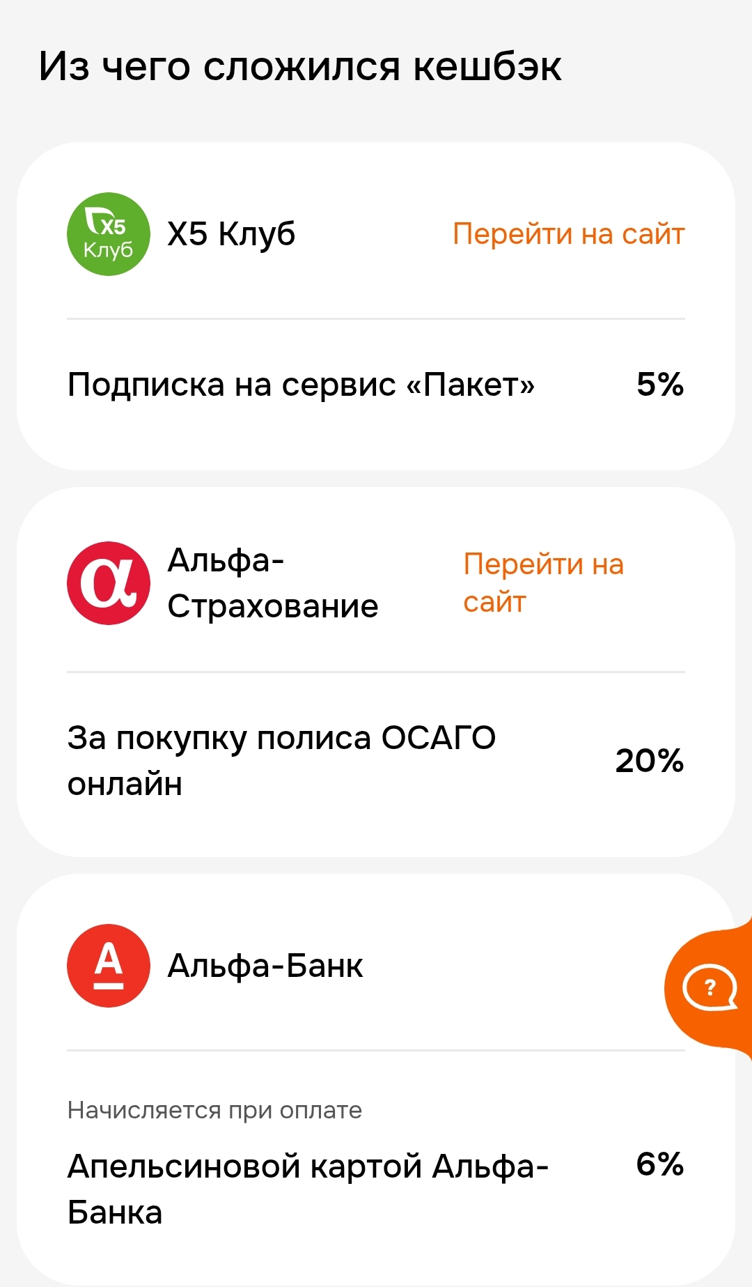 Выглядело это так я застраховал автомобиль на сумму 4000р, половину от этих денег можно вернуть апельсинами со счёта пятёрочки, после того как я это сделал мне предоставили кэшбэк на месяц +20% к моим 11%.