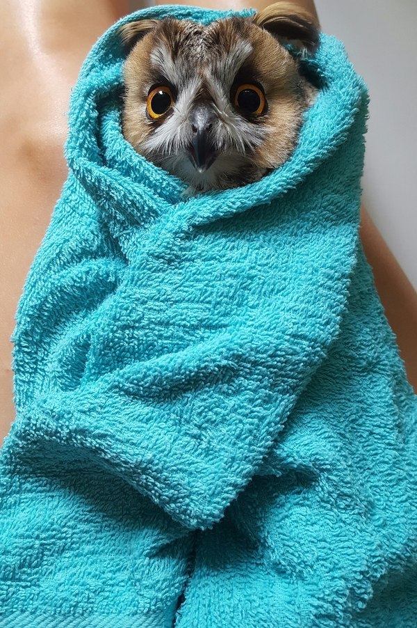 Сову нельзя насильно мыть под душем. Её НЕЛЬЗЯ после купания тискать, мять мокрое оперение, заворачивать в полотенцем. Своими действиями Вы ВРЕДИТЕ животному: