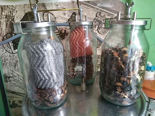 Конструкция простая и не требует существенных затрат. Берём медный провод, 1...2 метра (около килограмма), если такой как у меня. Распускаем на отдельные жилы, скручиваем в спирали - на палец, и заталкивает по максимуму в банку осушителя, можно с горкой. Чем больше влезет, тем лучше. Ну или купить готовую медную "мочалку". Если гнать много, по мере накопления налета, можно иногда промывать медь какой-нибудь кислотой.