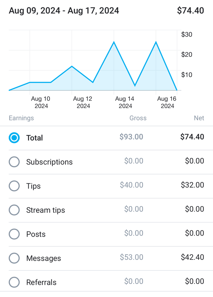 Заработали мы за неделю 75 долларов (заплатили юзеры 93, но минус комиссия ОФ): 12 на публичном контенте, остальное в привате. Учтите, что с этого еще, по-хорошему, придется заплатить налоги - а это минимум 12%, максимум 32% в моем случае. ОФ утверждает, что я уже в топ 48% креаторов с этим жалким выхлопом:)