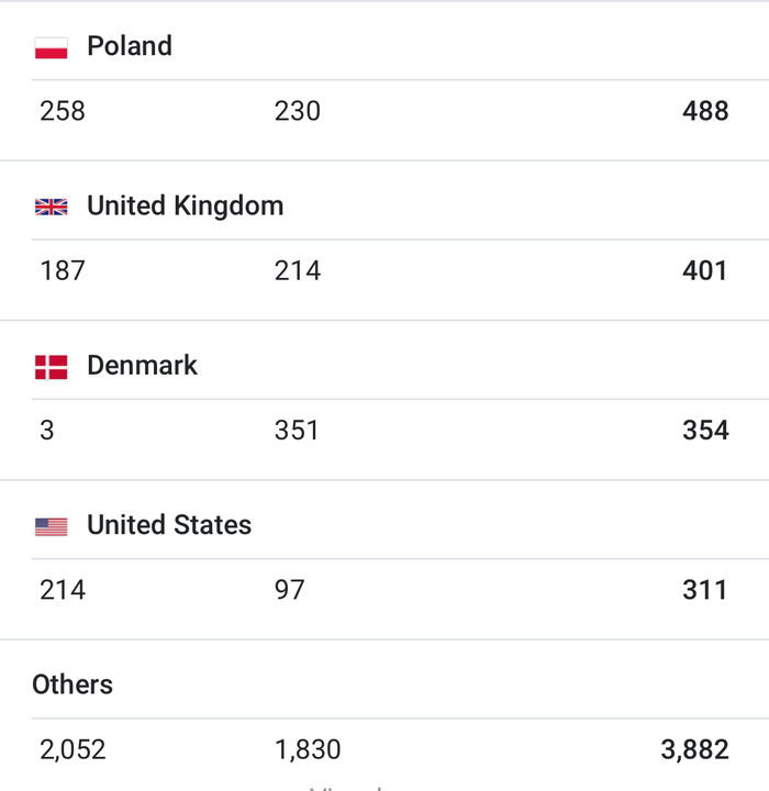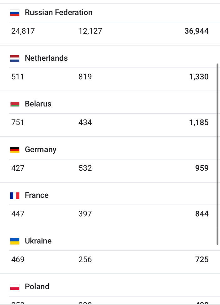 Гео подписчиков и мимокрокодилов - большей частью РФ, Беларусь, Украина + маленький процент из США, Германии, Франции и других стран отношу на счет пикабушников-эмигрантов. Вряд ли кто-то случайно мог бы зайти, в ОФ нет системы внутренних рекомендаций, насколько я поняла. В последние пару дней неожиданно на второе место вырвались Нидерланды, вот это странно. Я же вроде не на коньках и даже не на велике? По статистике: примерно 270 тысяч просмотров у исходного поста, около 30 тысяч просмотров в ОФ, юзеров из которых - половина.
