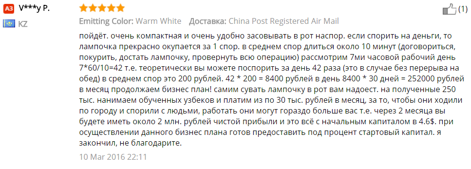 1029 ivanov1986 "Ламповый" бизнес-план 9 лет назад Искал УФ лампы, наткнулся на готовый теплый ламповый бизнес-план. А вот сама лампа: Ссылка: http://ru.aliexpress.com/item/Ultra-Bright-E27-UV-Ultraviole... AliExpress Отзыв Бизнес Лампа Бизнес-идея
