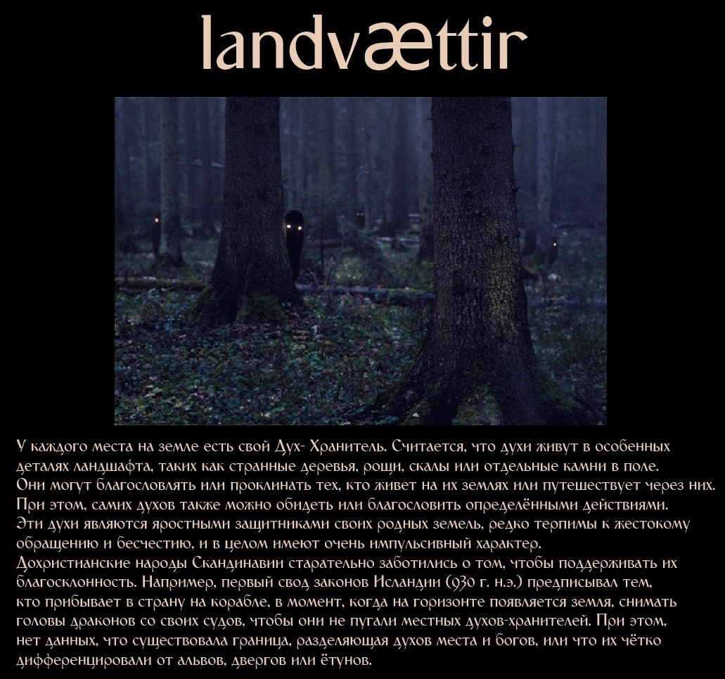 У каждого места на земле есть свой Дух- Хранитель. Считается, что духи живут в особенных деталях ландшафта, таких как странные деревья, рощи, скалы или отдельные камни в поле. Они могут благословлять или проклинать тех, кто живет на их землях или путешествует через них. При этом, самих духов также можно обидеть или благословить определёнными действиями. Эти духи являются яростными защитниками своих родных земель, редко терпимы к жестокому обращению и бесчестию, и в целом имеют очень импульсивный характер. Дохристианские народы Скандинавии старательно заботились о том, чтобы поддерживать их благосклонность. Например, первый свод законов Исландии (930 г. н.э.) предписывал тем, кто прибывает в страну на корабле, в момент, когда на горизонте появляется земля, снимать головы драконов со своих судов, чтобы они не пугали местных духов-хранителей. При этом, нет данных, что существовала граница, разделяющая духов места и богов, или что их чётко дифференцировали от альвов, двергов или ётунов.