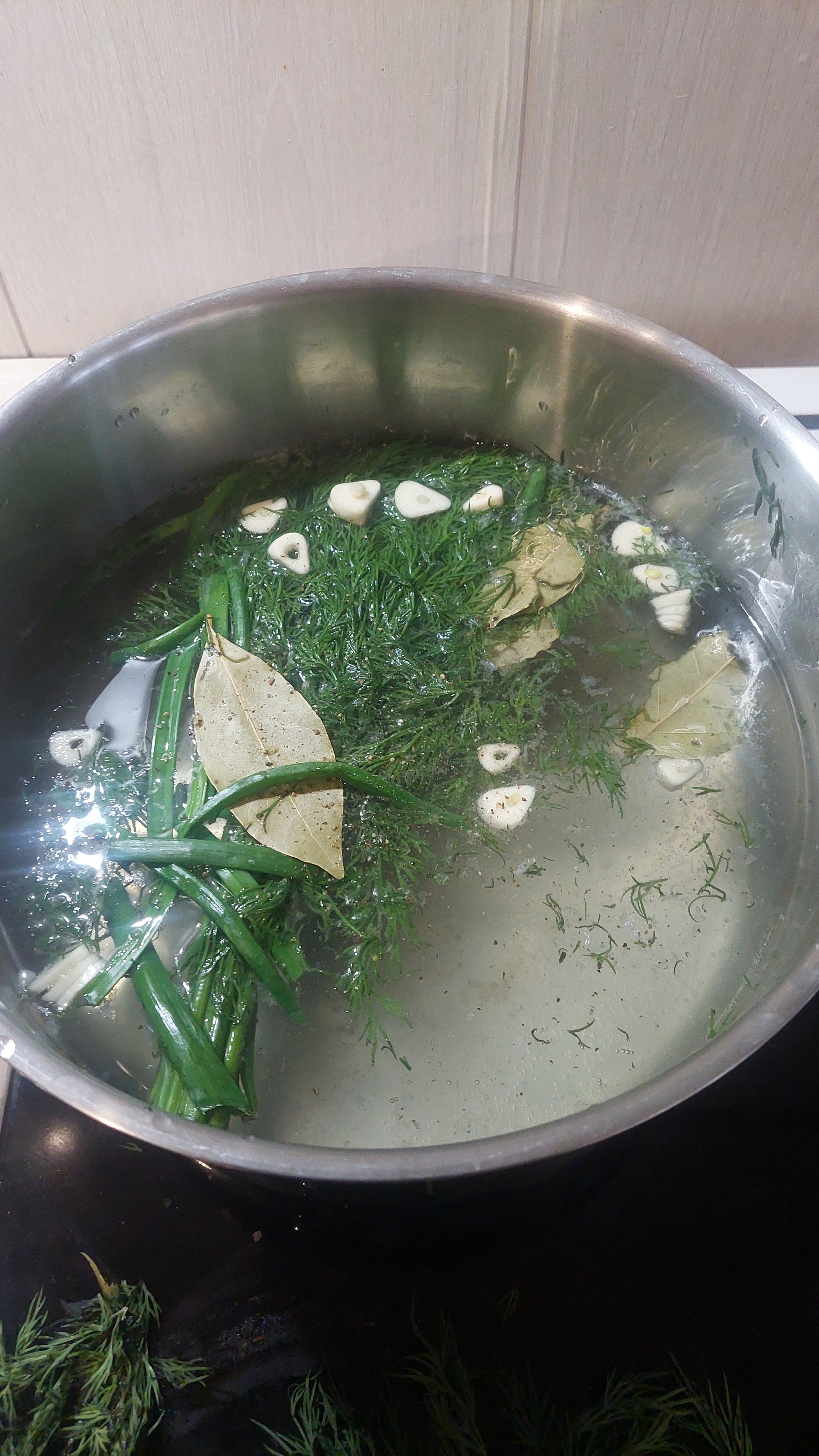 Добавил лук, укроп, петрушку, лавровый лист, чеснок, перец и соль