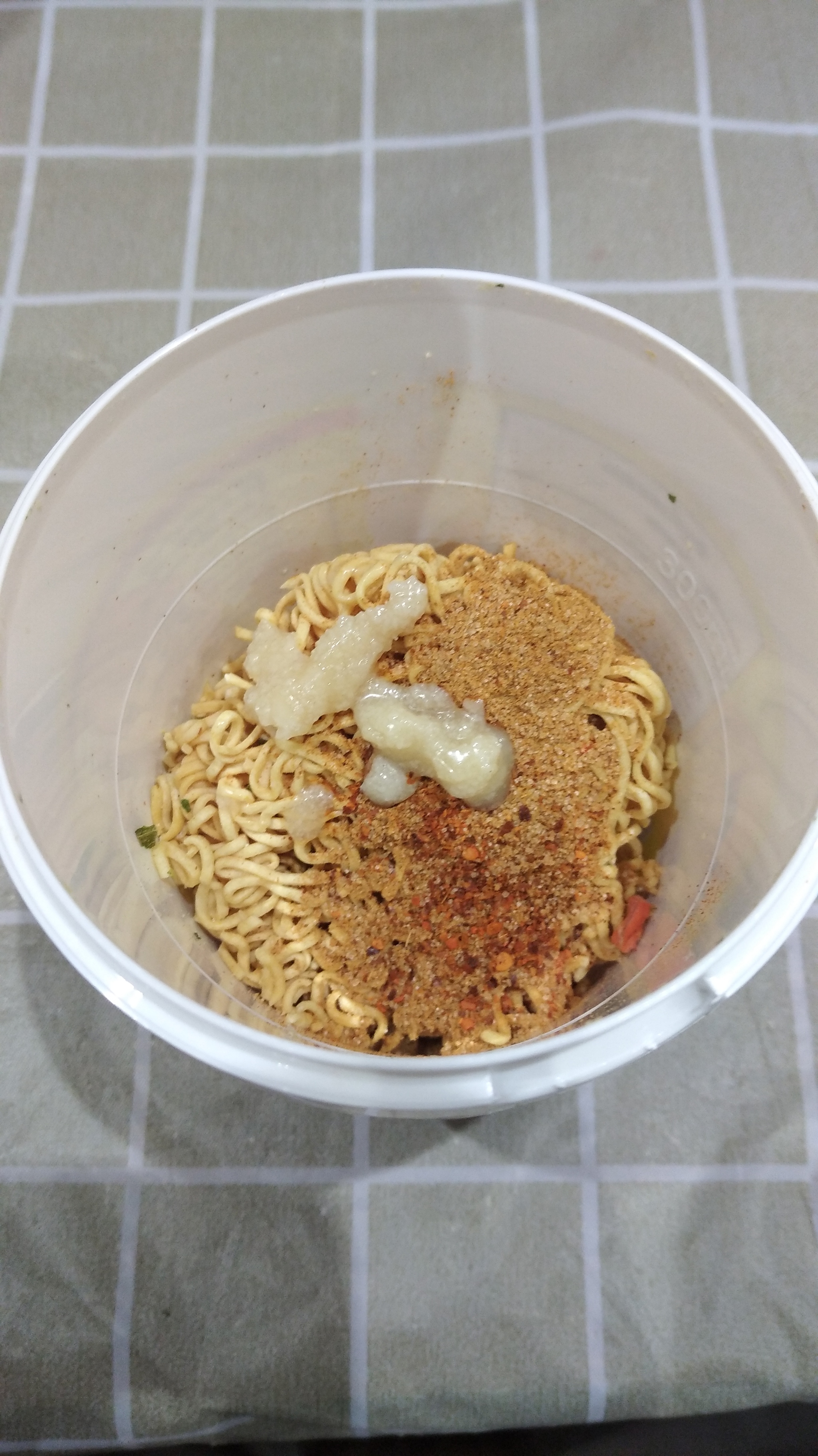 По инструкции добавляем все ингредиенты, заливаем кипятком до отметки внутри и ждём 3 минуты. Кстати, очень удобно что острый перец в отдельном пакете и можно самому выбирать остроту. Поскольку я люблю острое то бахнул весь.