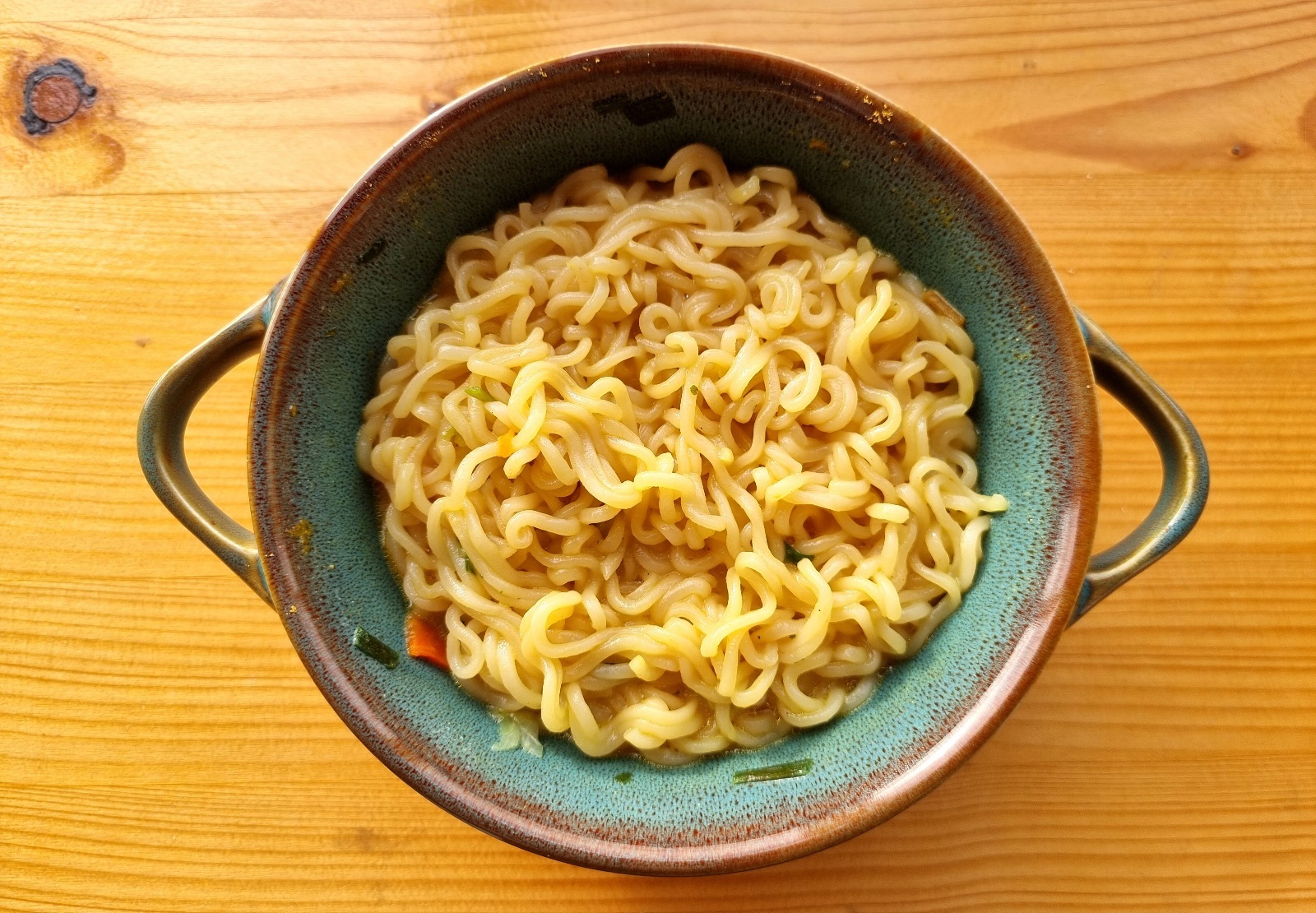 Готовим по инструкции - кипятим лапшу и сушёности 5 минут, затем сливаем воду, оставив пару столовых ложек кипятка для нажористости, перекладываем в экспериментальную тарелку и перемешиваем с порошковой приправой. Никаких дополнительных яиц и мясов я добавлять не стал в рамках чистоты эксперимента.