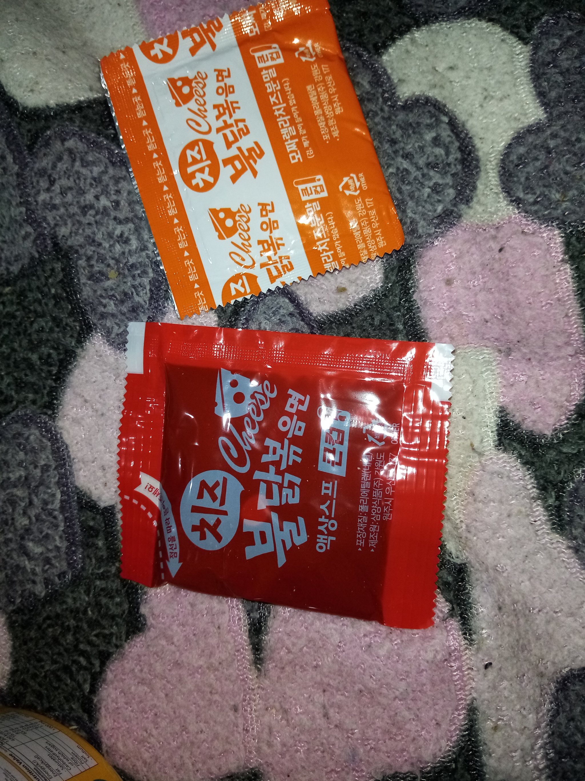 Первым делом нас встречают 2 пакетика. Оранжевый-сырный порошек,красный- соус из перца.