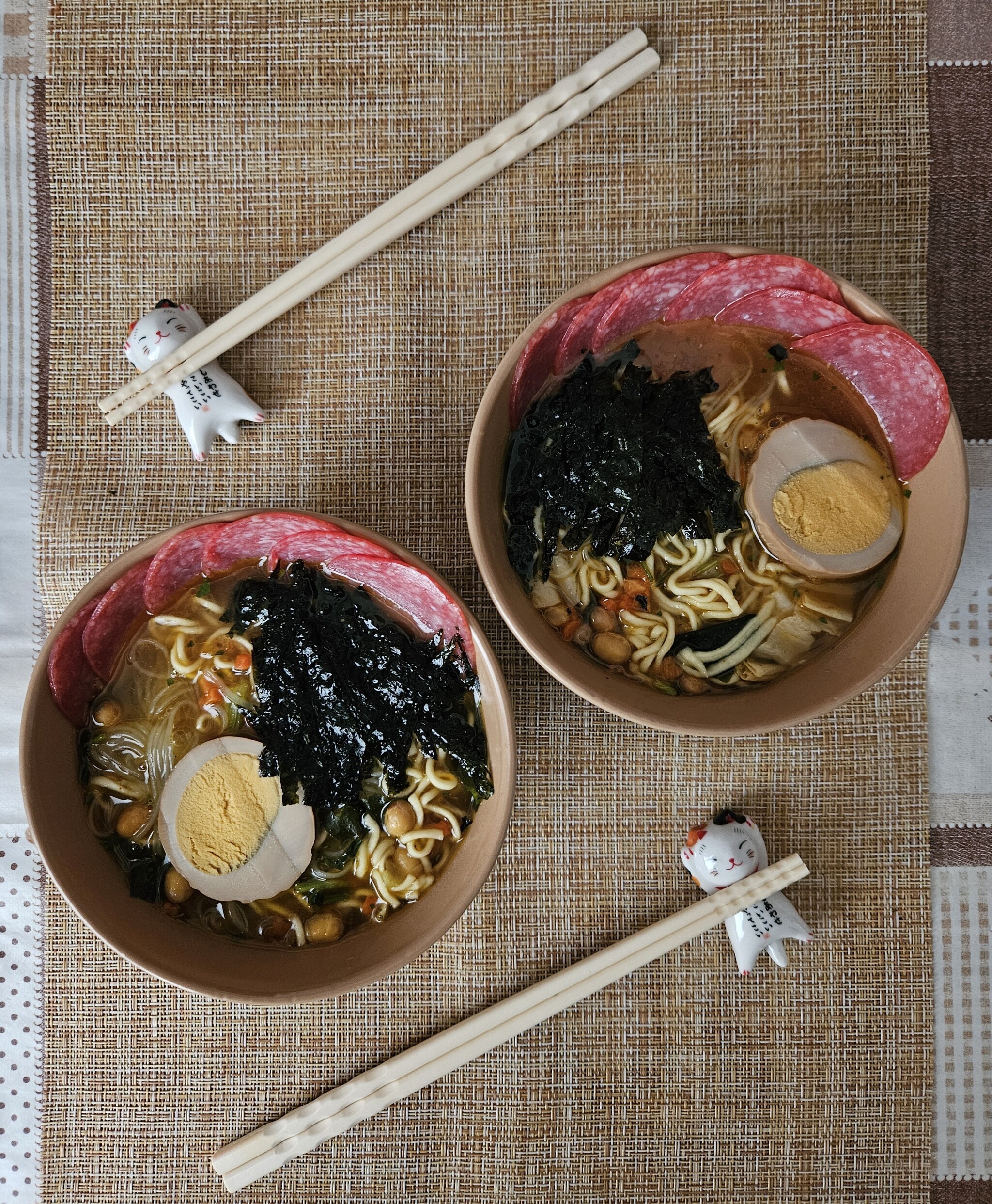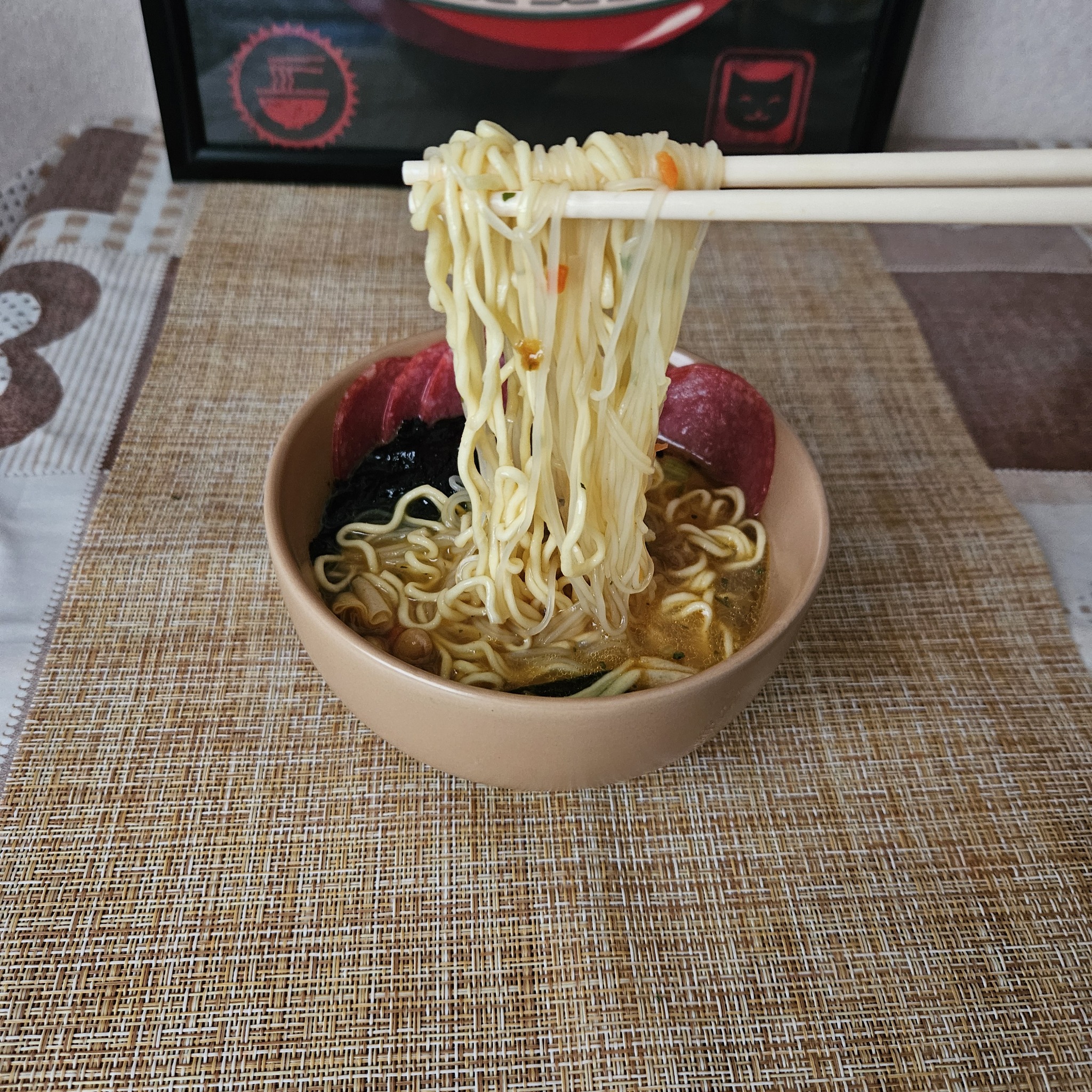 Все вышеназванные ингредиенты закладываем назад в чашку и заливаем кипятком до линии. Затем оставляем на 4 минуты под крышкой. Перемешав, можно подавать к столу. Так как сегодня в исследовании принимает участие коллега, то порцию делим на двоих. Тем более, что вышла она огромная. От себя подкинул не каноничной колбасы да немного чипсов из нори. В результате получаем две вполне приличных порции.