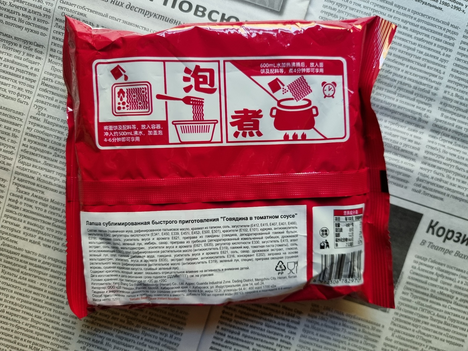 Лапша упакована в яркую пачку насыщенно-алого оттенка. Несмотря на броский цвет, оформление весьма лаконично - иероглифы да схематичный человечек в боевой стойке, и на полках пачка теряется среди себе подобных, не вызывая особого желания положить в корзину именно эту лапшу. Я тоже взял её, ориентируясь исключительно на невысокую цену и заранее не ожидая, в общем то, ничего хорошего от лапши в такой скучной упаковке. С обратной стороны есть инструкция по приготовлению в картинках и нетипично качественно напечатанный и ровно наклеенный стикер от поставщика, в котором содержится информация о составе, пестрящая всевозможными Е-добавками.