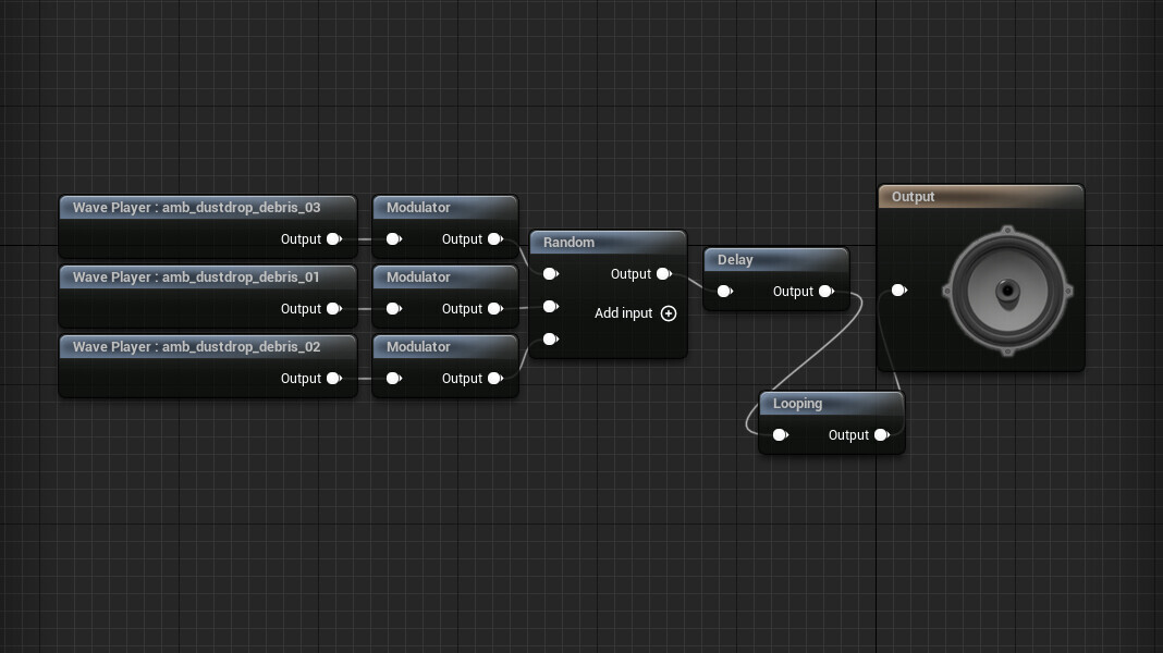 Звуки осыпающихся камней — это Sound Cue с параметрами рандома, задержки и зацикленности. Дёшево и сердито. Но эффективно. В планах было ещё и патиклы добавить, но от них я вовремя отказался — увлекаться ненужными детальками было не время.