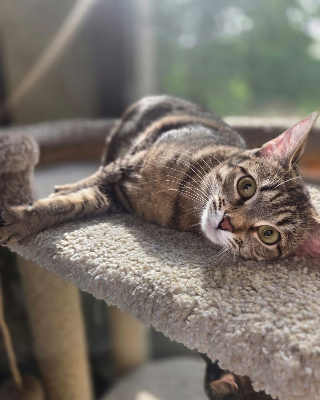 Очень ласковая и контактная кошечка. Любит гладиться: только протягиваешь к ней руку — и она аж окунается в нее. Крутится, чтобы ее везде погладили.