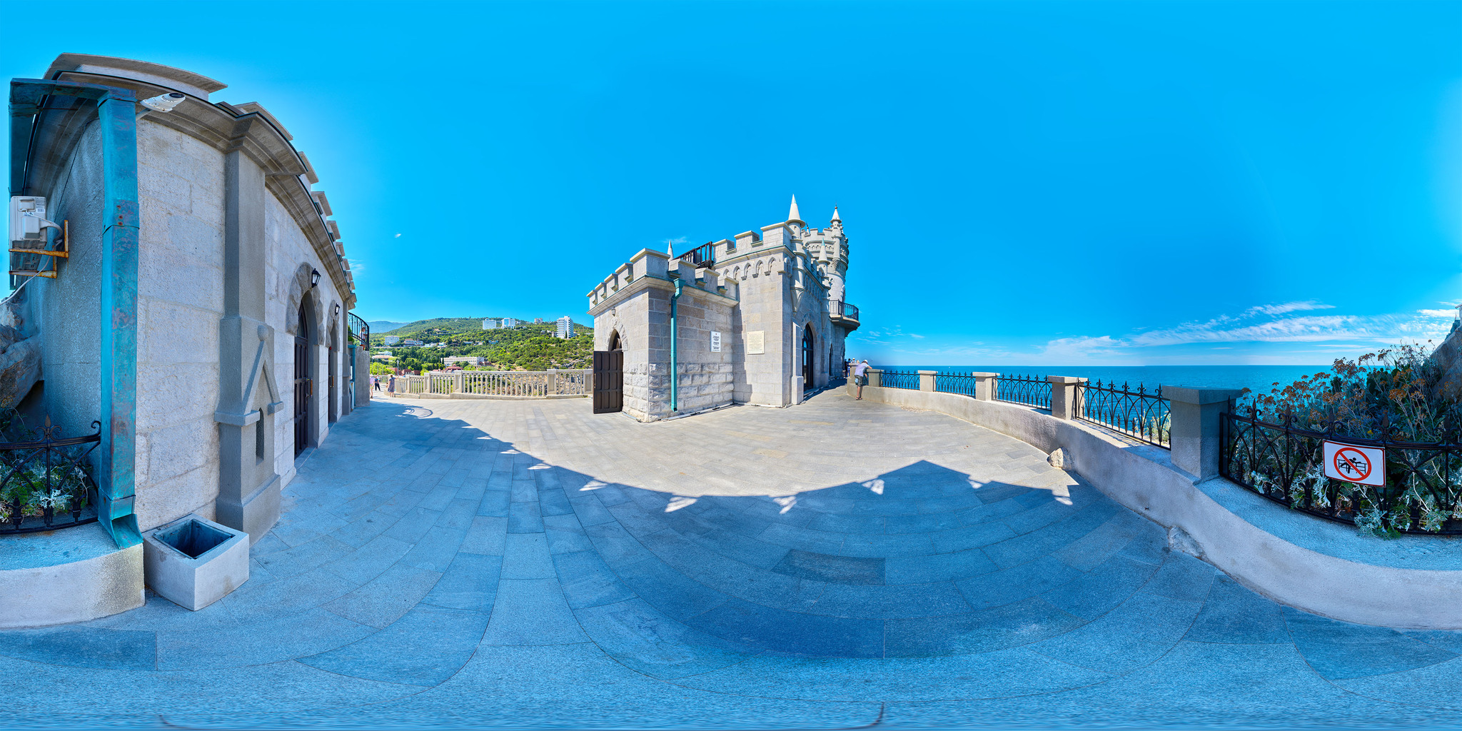 Сферическая панорама площади, где стоит это знаменитый замок. Гаспра, Большая Ялта, республика Крым, Россия. 14.07.2024.