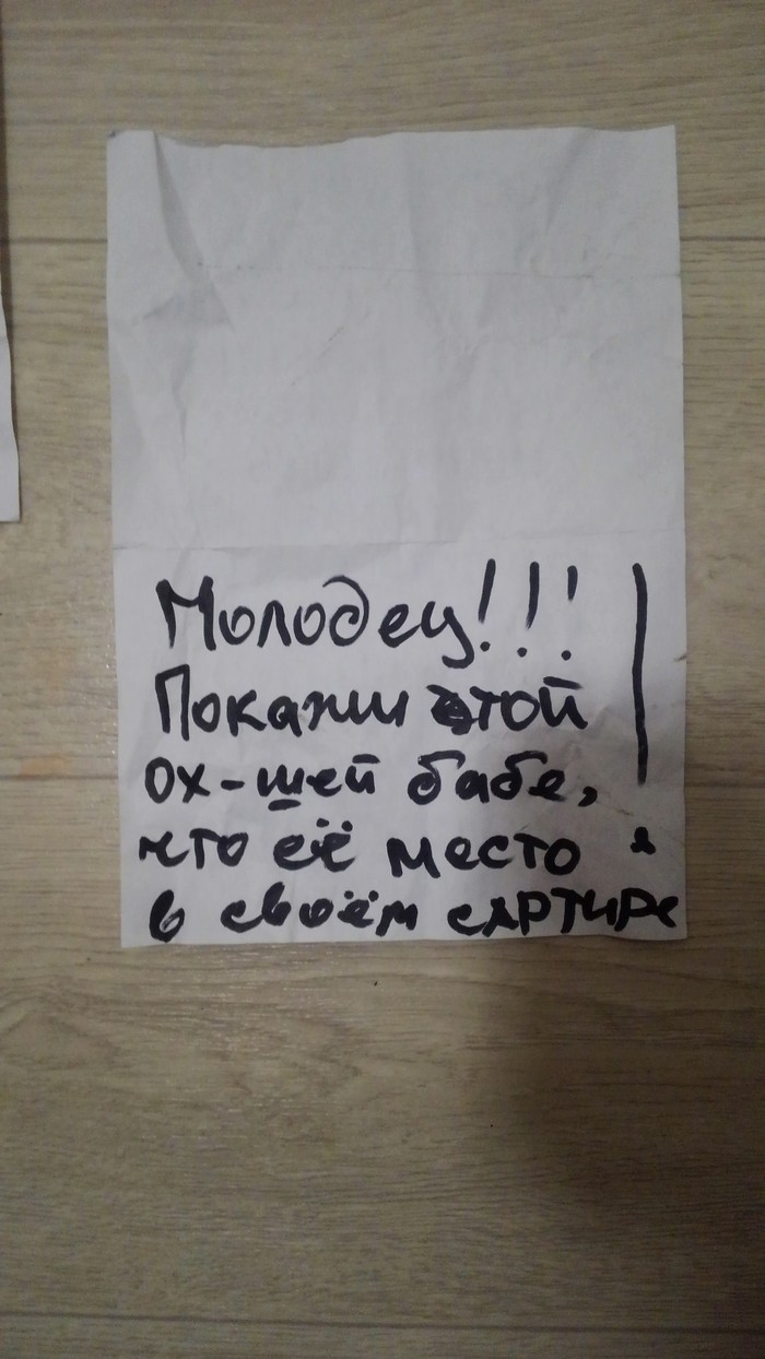 Ах! Как он оказался прав! Напомню, что фактически мест два, а второе практически всегда занято седаном местных алкоголиков, но они хотя бы бумажек не пишут. И так-как она лежала два дня, похоже кто-то добавил от себя на другой стороне: