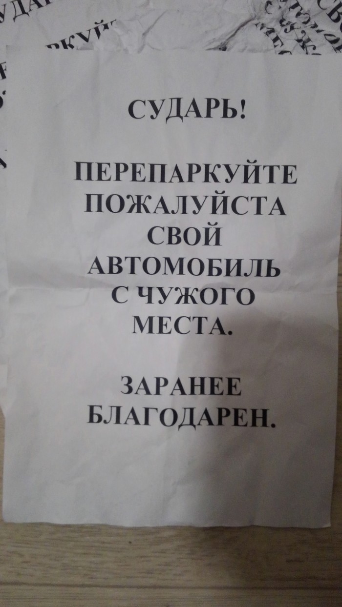 Через некоторое время ситуация повторилась. Сделал вывод, что у гражданина явно умственное недомогание, проштудировав труды академика Павлова, решил, что с такими рефлексами надо бороться. Как раз в РФ начался (точнее усилился) экономический спад, меня выгнали в отпуск и я поставил свой автомобиль на это место. Вечером, идя с детсада забирал из под дворника бумажку. На четвёртый день, забыл про это, но оказывается произошёл сдвиг - на бумажке появился другой текст:
