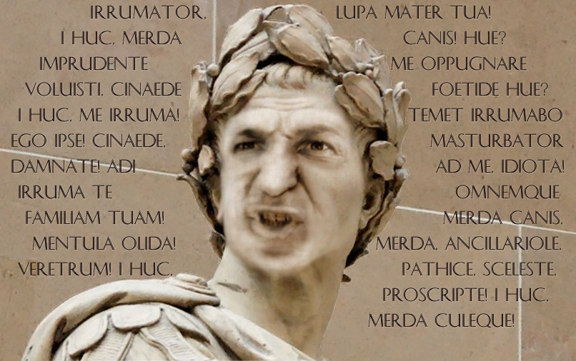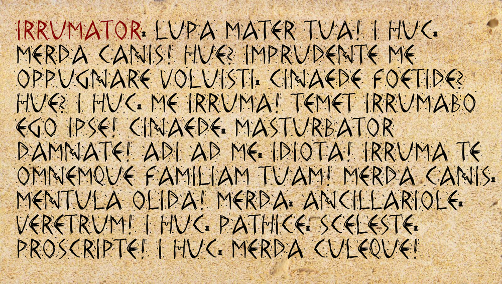 IRRUMATOR, LUPA MATER TUA! I HUC, MERDA CANIS! HUE? IMPRUDENTE ME OPPUGNARE VOLUISTI, CINAEDE FOETIDE? HUE? I HUC, ME IRRUMA! TEMET IRRUMABO EGO IPSE! CINAEDE, MASTURBATOR DAMNATE! ADI AD ME, IDIOTA! IRRUMA TE OMNEMQUE FAMILIAM TUAM! MERDA CANIS, MENTULA OLIDA! MERDA, ANCILLARIOLE, VERETRUM! I HUC, PATHICE, SCELESTE, PROSCRIPTE! I HUC, MERDA CULEQUE!
