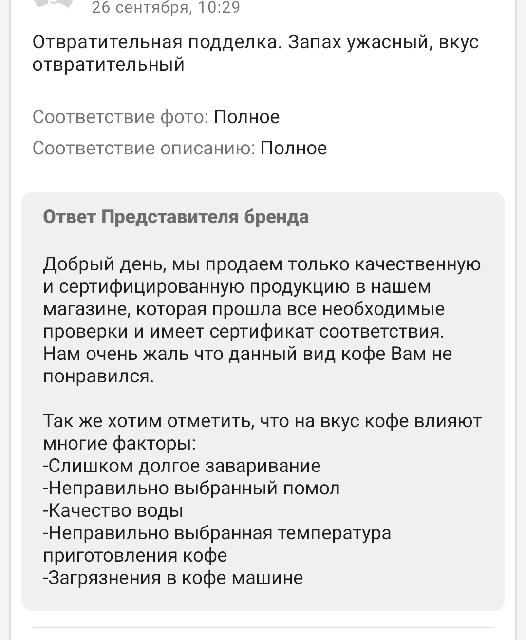 Был оставлен негативный отзыв, на который "представитель бренда" ответил, что их сертифицированные товары исключительно высочайшего качества и все проблемы - из-за неправильной заварки, качества воды, ее температуры (никогда такого не было, и вот опять, еще, вероятно, надо было предварительно проверить гороскоп и хорошенько помолиться).