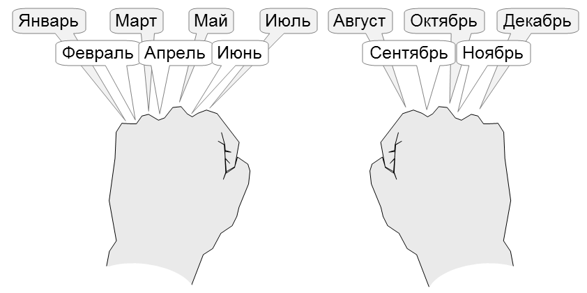 1287 fab3r Лайфхак из детства. 11 лет назад До сих пор считаю сколько дней в месяце по костяшкам на кулаке. [моё] Лайфхак Время Детство Текст