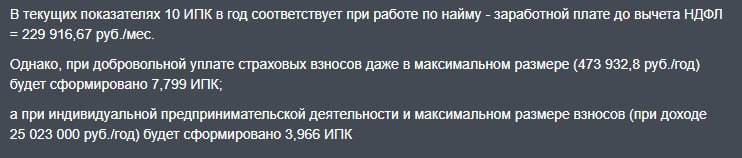 Если вы не имеете такой официальной зарплаты по тем или иным причинам, то достаточно лишь докидывать деньги. Т.е. если вам будет не хватать количество ИПК, то их просто-напросто можно купить. Для этого нужно будет заплатить. За 473.000 ₽ рублей в год вам докинут 7,8 ИПК.