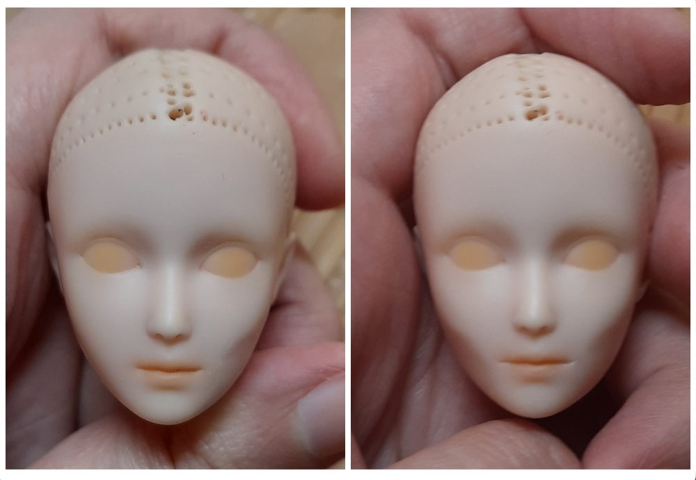 Нормальные профессиональные ООАКеры, прежде чем делать портретную куклу, тщательно подбирают молд, опираясь на скульптуру лица, выдающиеся черты, скинтон и прочее, прочее, профессиональное, нудное, идеальное... Портретки - это все равно не про меня, тем более, что у меня уже была китайская кукла со стандартным молдом, а т.к. гибридизацией я досыта накушалась на прошлом проекте (голову Матильде я, кстати, заменила, но это уже совсем другая история), то работала с тем что есть... Я рада, что обретенный в отсутствие какого-либо смысла всего сущего пофигизм научил меня не бояться испортить какую-либо вещь, а если испорчу - то не расстраиваться. Поэтому я сделала кукольной голове пластическую операцию, отрезав ей щеки выделив скулы и сделав улыбку Глазго немного расширив линию рта.