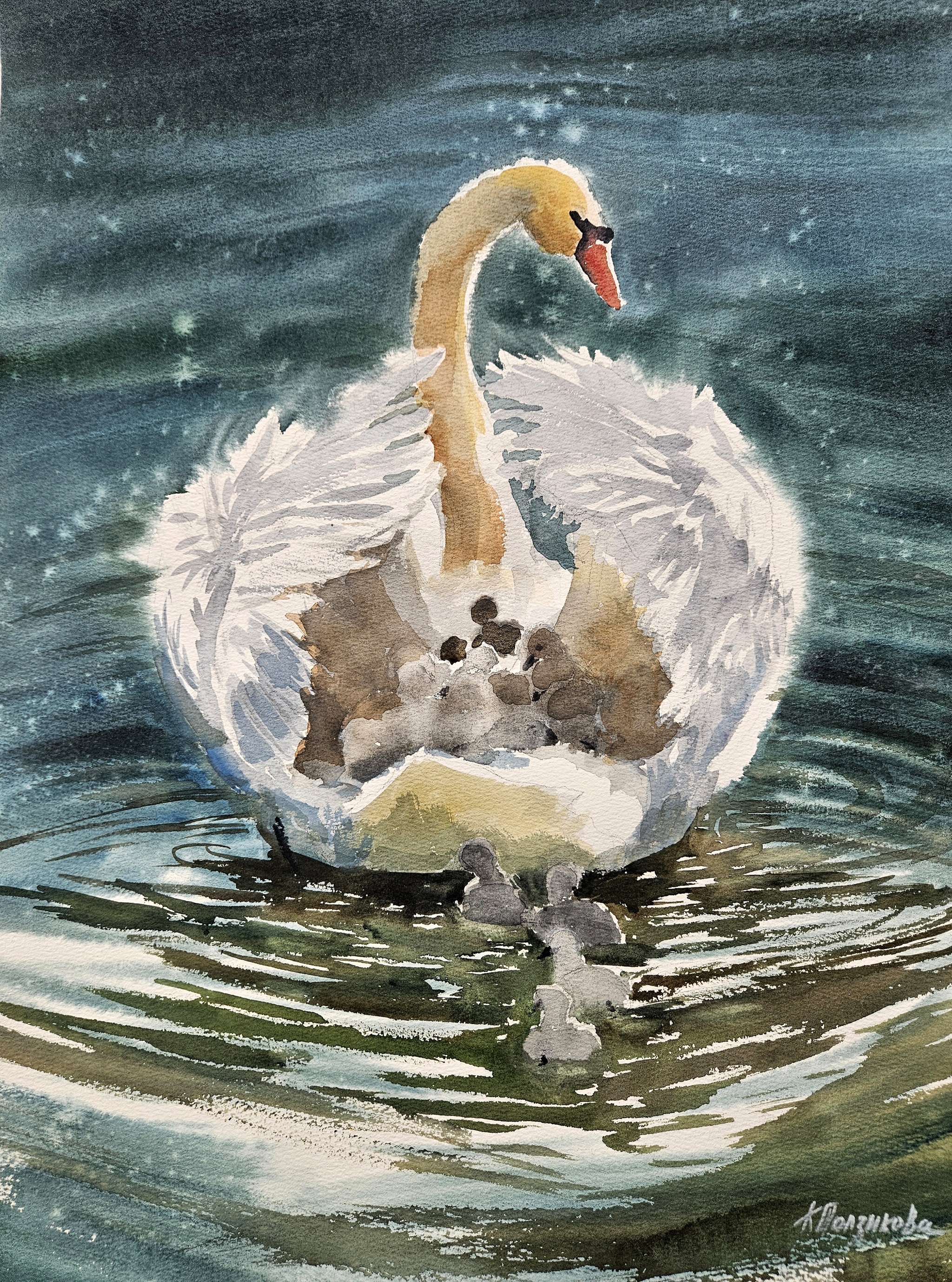 В этой картине грациозный лебедь символизирует преподавателя танца. Того, кто бережно ведёт и вдохновляет. Маленькие лебедята рядом с ним олицетворяют учеников, которые только начинают свой путь и с доверием следуют за наставником. В их ещё неуверенных движениях уже рождается будущая грация. Эта работа для меня о заботе, вдохновении и той особенной связи, которая возникает между преподавателем и учениками. О том, как через терпение, поддержку и любовь рождается красота балета!