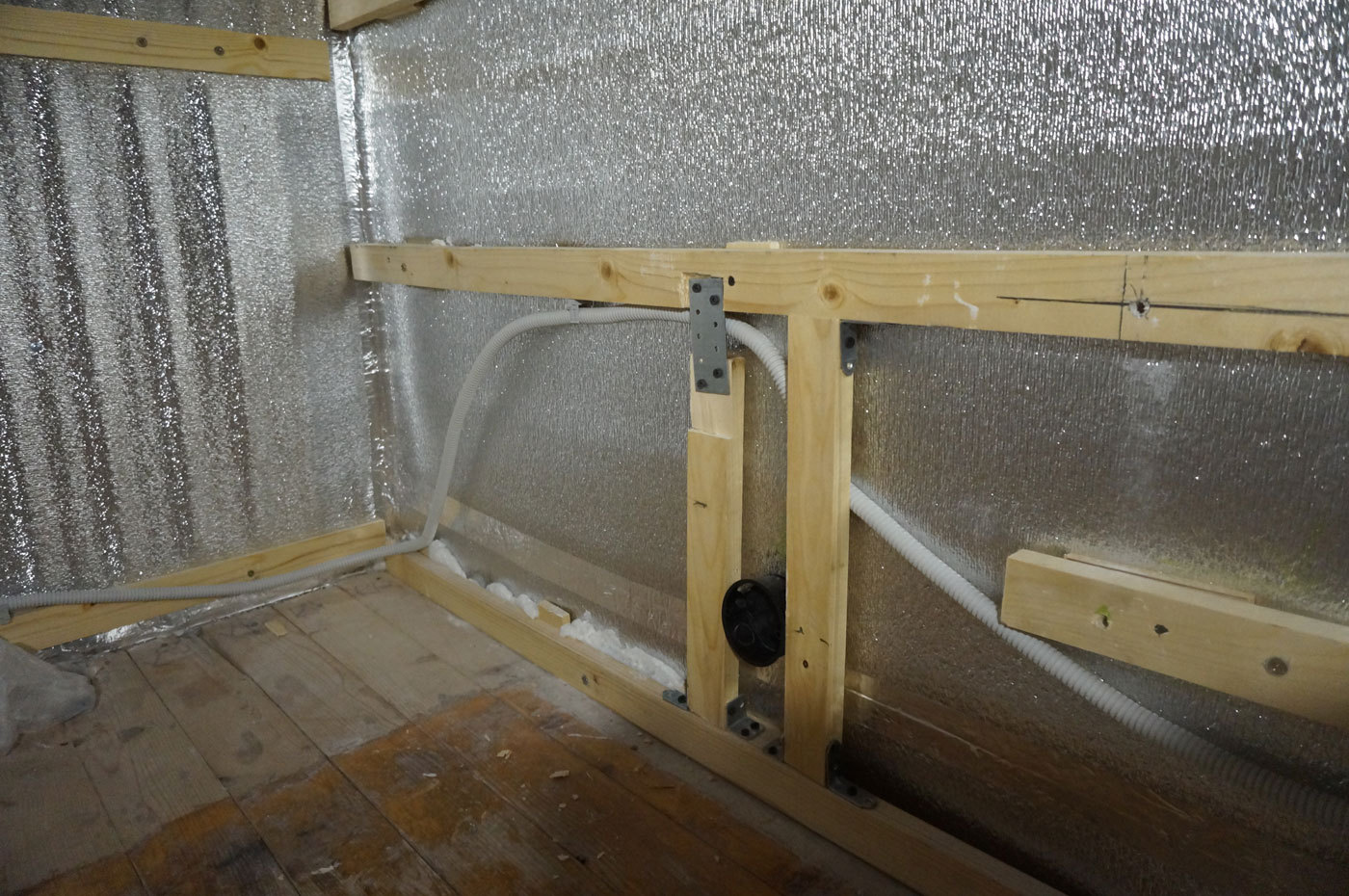 Помимо самой обрешетки еще пришлось сделать основание для крепления конвекторов и вертикальные доски заложить, между которых крепились подрозетники.