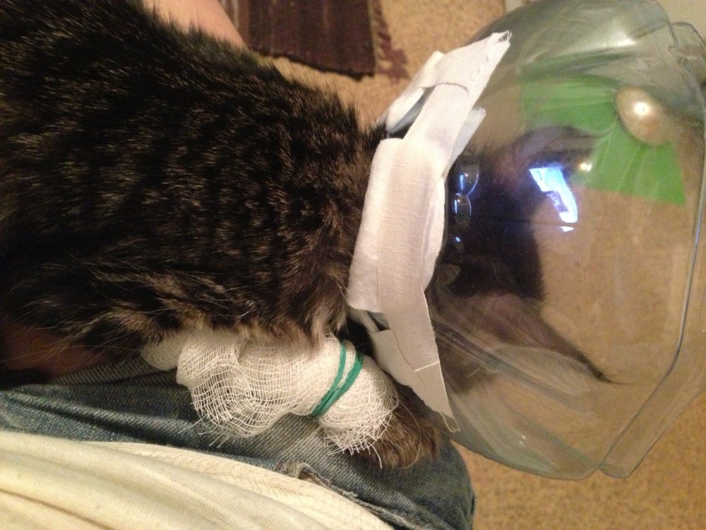 Котейка подцепил лишай, аж 5 штук, лекарство слизывает с лапы, по этому лапку в бинт, а на голову шлем)