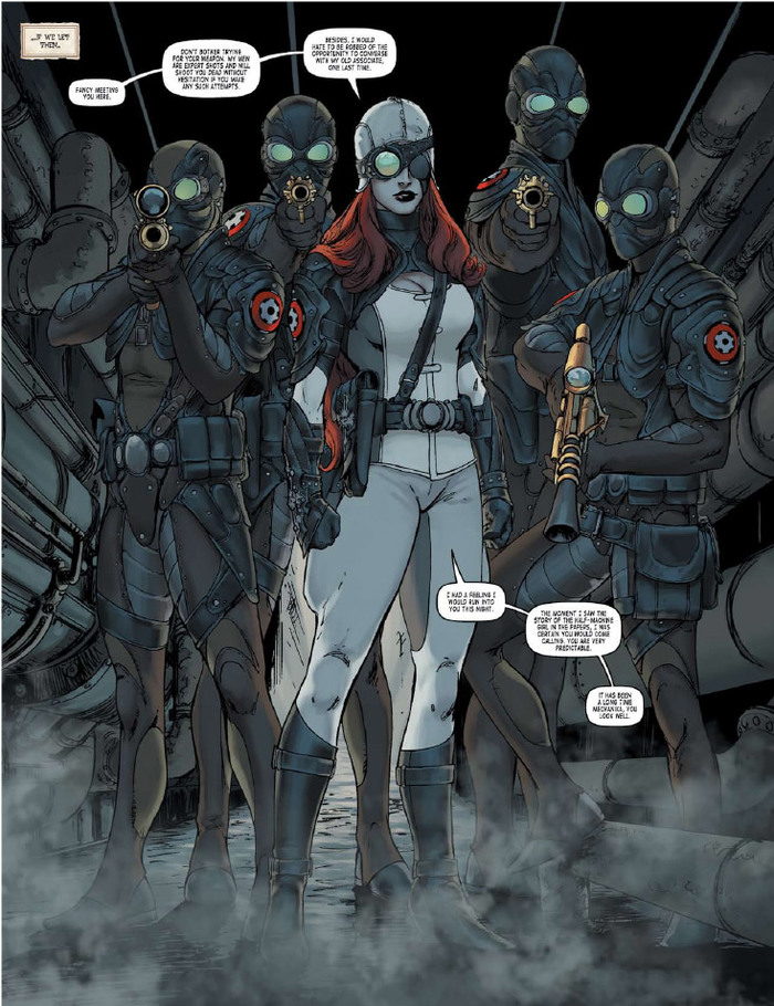 В общем история сразу скажу не слишком оригинальная, хотя своя изюминка в ней всё же есть, ведь происходит всё в альтернативной истории в Великобритании. К тому же автору удаётся внести в повествование интересных персонажей (мне лично запомнились братья клоуны из цыганского цирка и их ручная обезьяна), а схватки и перестрелки заполнить интересными диалогами (чего только стоит постоянная перепалка главной героини с её помощников Льюисом).