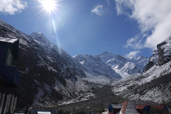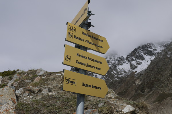Ездили мы группой весной 2016 года в туристический поход, на ледник Безенги, который находится на границе Кабардино-Балкарской Республики и Грузии. Обосновались мы в альплагере Безенги, который находится на высоте 2500 метров над уровнем моря. До него идет очень узкая горная дорога, на дороге часто встречаются "опавшие" валуны. Перед въездом в лагерь, отмечались на пограничном КПП (пропуски оформляются заранее, как и страховка, на случай эвакуации вертолётом). В альплагере часто проходят соревнования по альпинизму, в т.ч. спецподразделений и даже есть детский сад. То ли единственный высокогорный в России, то ли самый высокий из имеющихся. Лагерь находится на самообеспечении. Вот его фото с небольшой вершины и окрестностей: