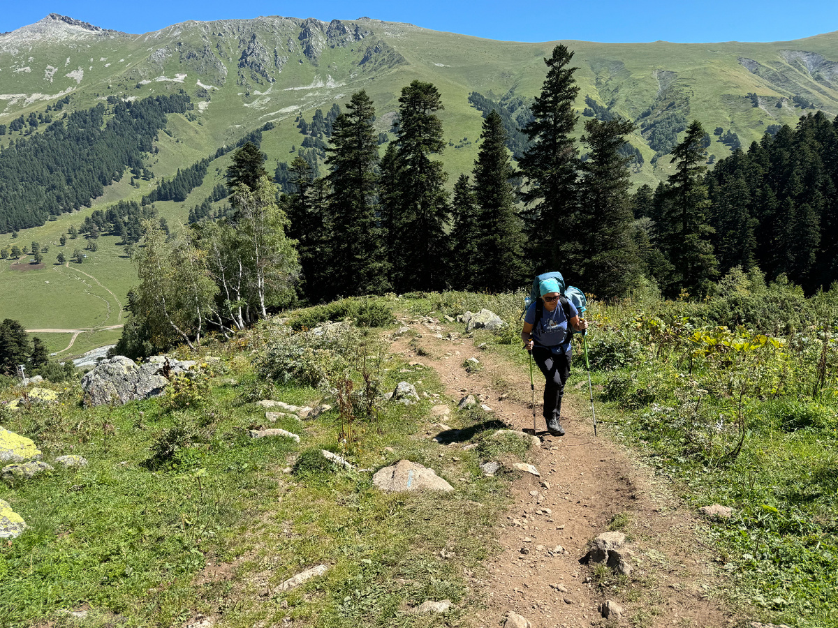 Маркированная тропа резко уходит вверх по правому берегу ручья. Набор высоты там приличный – сразу до 2400 м. Левый берег выглядел более пологим, пошли по нему: на правом надо было перелезать через большие камни. А по левому, земляному, видимо, водят лошадей: до перевала ты можешь доехать верхом. От поляны Таулу – 10 тысяч рублей в 2024 году. На этом участке вообще разброд и шатание: кто от водопада идет, кто откуда-то с соседней горы спускается, и троп – штук пять точно. Но есть направление, не заблудишься.
