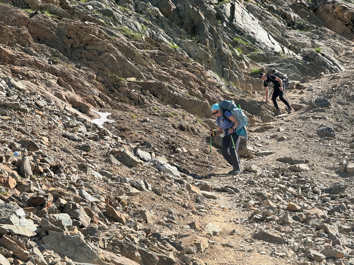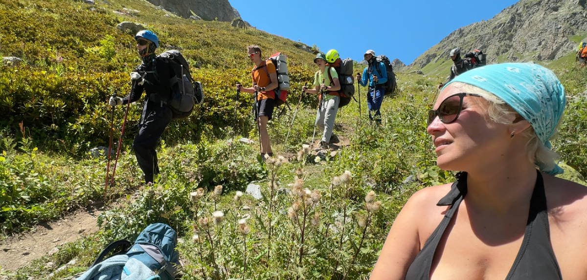 Карабкаясь, нагнали женщину с посохом: преподавательница истории из Иркутска, Марина, в горах не новичок, но больше в своих, сибирских. Сетовала, что с треккинговыми палками в самолет не пустили. Алеша предложил ей свои – она отказалась и мужественно продолжила взбираться. Правда, ее рюкзак был существенно меньше наших: основную ношу взял на себя взрослый сын, с которым они путешествовали вдвоем.