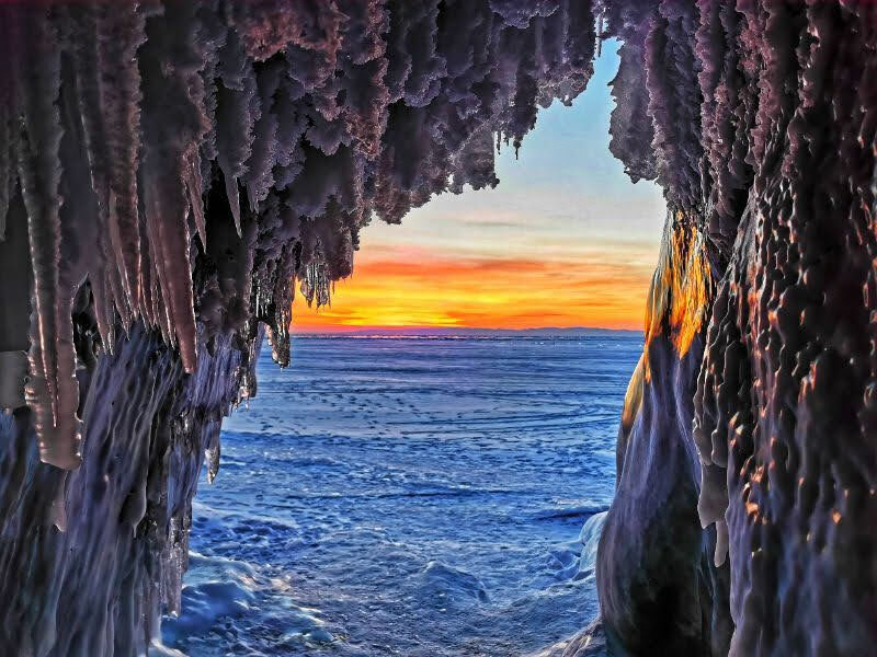Замечаю в одном месте бреш, узкая такая и низкая полоса между глыбами льда сверху и застывшей водой Байкала. Пещерка спрятана за торосами, и с дороги её нельзя увидеть.