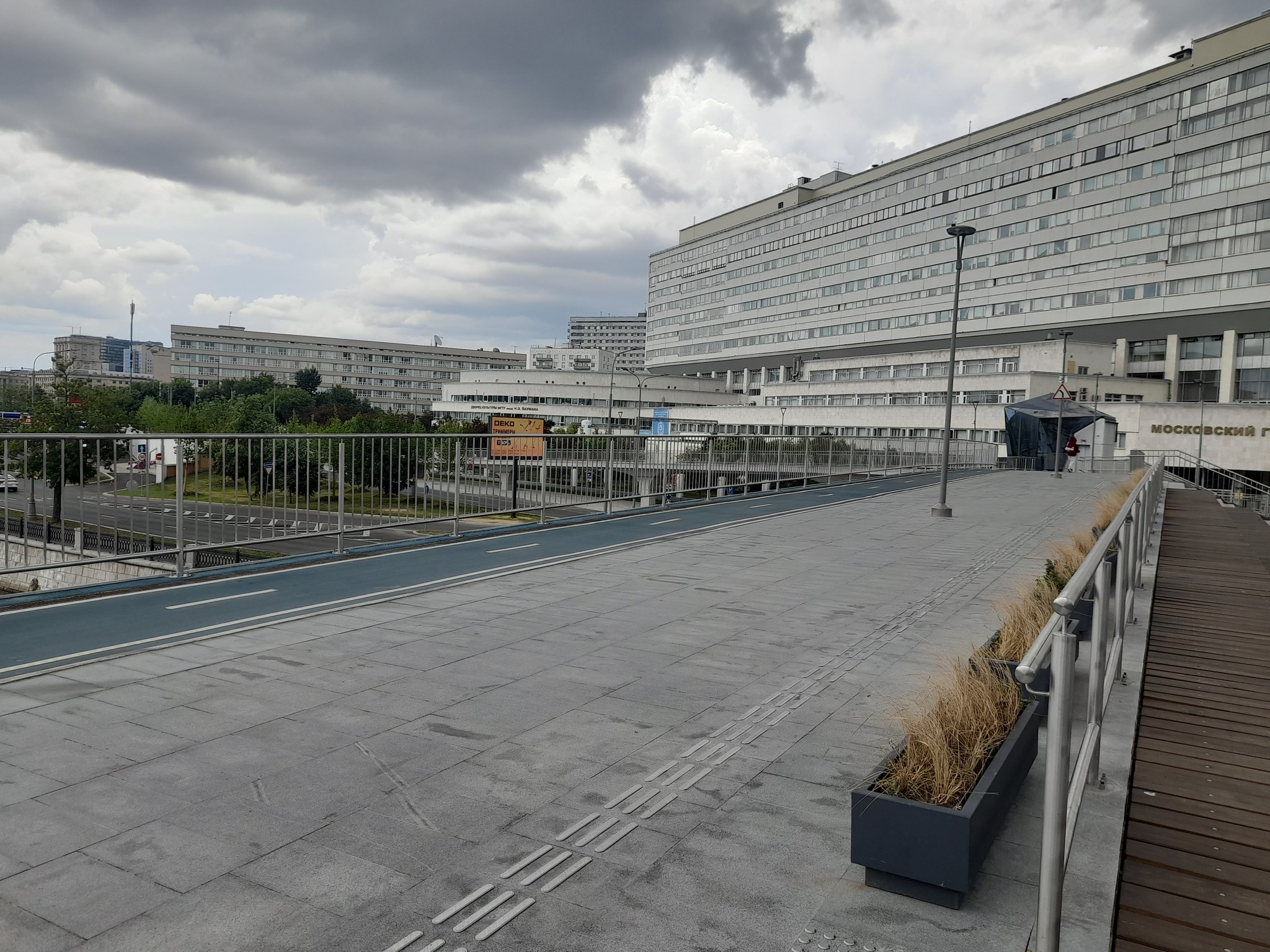 Мы пока идём по Госпитальной набережной, и приближаемся к новому велопешеходному мосту, построенному как раз в связи с ростом спортивного кластера. Потому что Спортивный Комплекс МГТУ там уже был, и к нему по Госпитальному мосту и ходили, но с развитием университета стал актуален вопрос более лёгкой бессветофорной связи его частей.