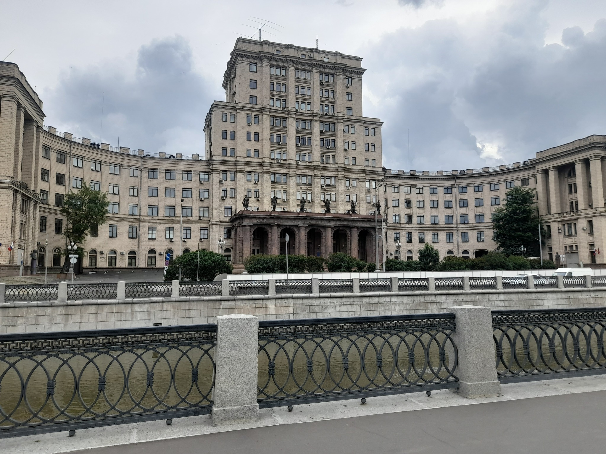 Проходим мимо здания Факультета Энергомашиностроения МГТУ, а впереди уже виднеется Госпитальный мост. За госпитальным мостом высится свежепостроенное здание Кафедры Адаптивной Физической Культуры (АФК), слева от которого относительно невысокий, но более длинный новый кампус "Спектр".