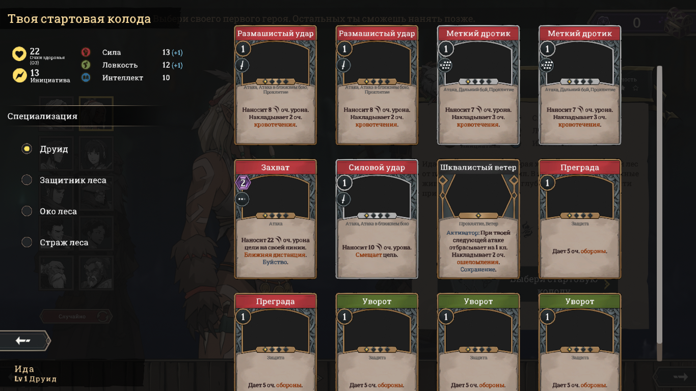 Есть тут различные классы, а также "на вкус и внешность(цвет)". Я взял друида, и можно прочитать что она умеет, какая у неё мотивация и так далее. А также выбрать "стартовую колоду"