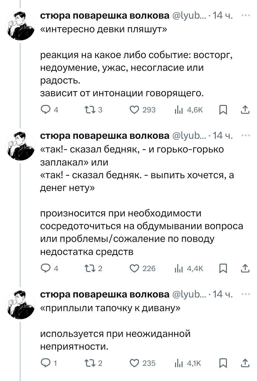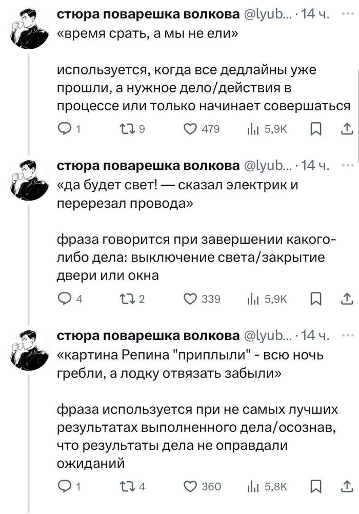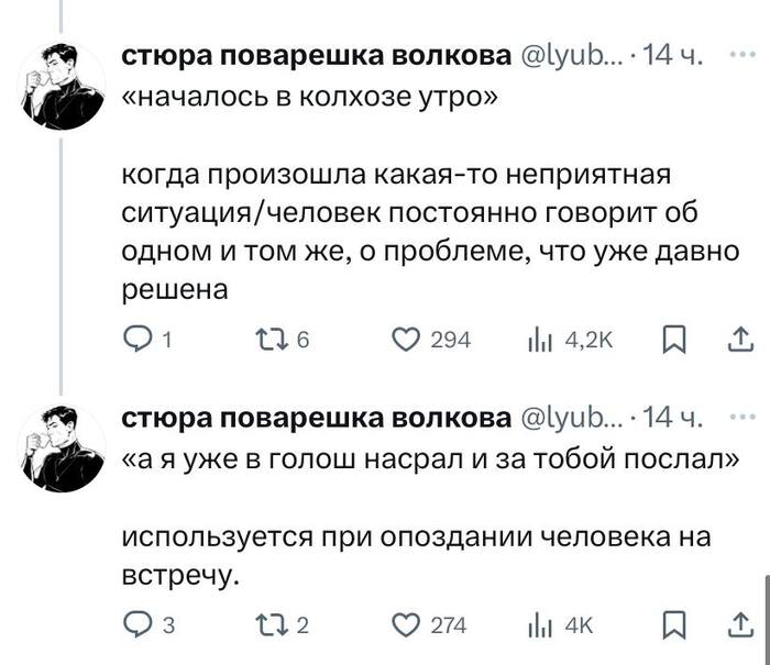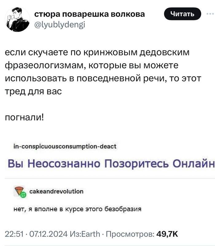 9 Lu86 Юмор Легендарные фразы деда 1 год назад В Твиттере выкатили легендарные фразы деда.Используйте в повседневной жизни. Бонусом чел расписал значения и ситуации, при которых можно использовать этот словарь. Юмор Фраза Дед Высказывание Картинка с текстом Длиннопост Ещё 0