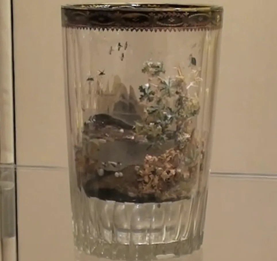 Более 200 лет назад стекольных дел мастер крепостной Александр Вершинин создавал уникальные двухслойные стаканы, между стенками которых располагались целые картины, точнее, маленькие макеты пейзажей, сделанные из камешков, мха, соломы, цветных ниточек и бумаги.