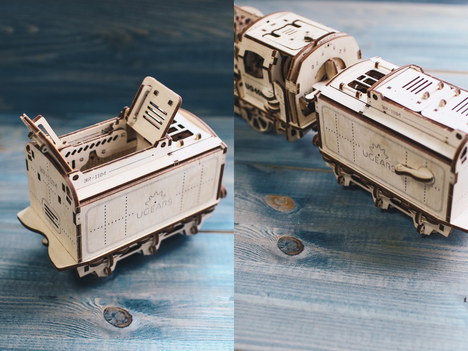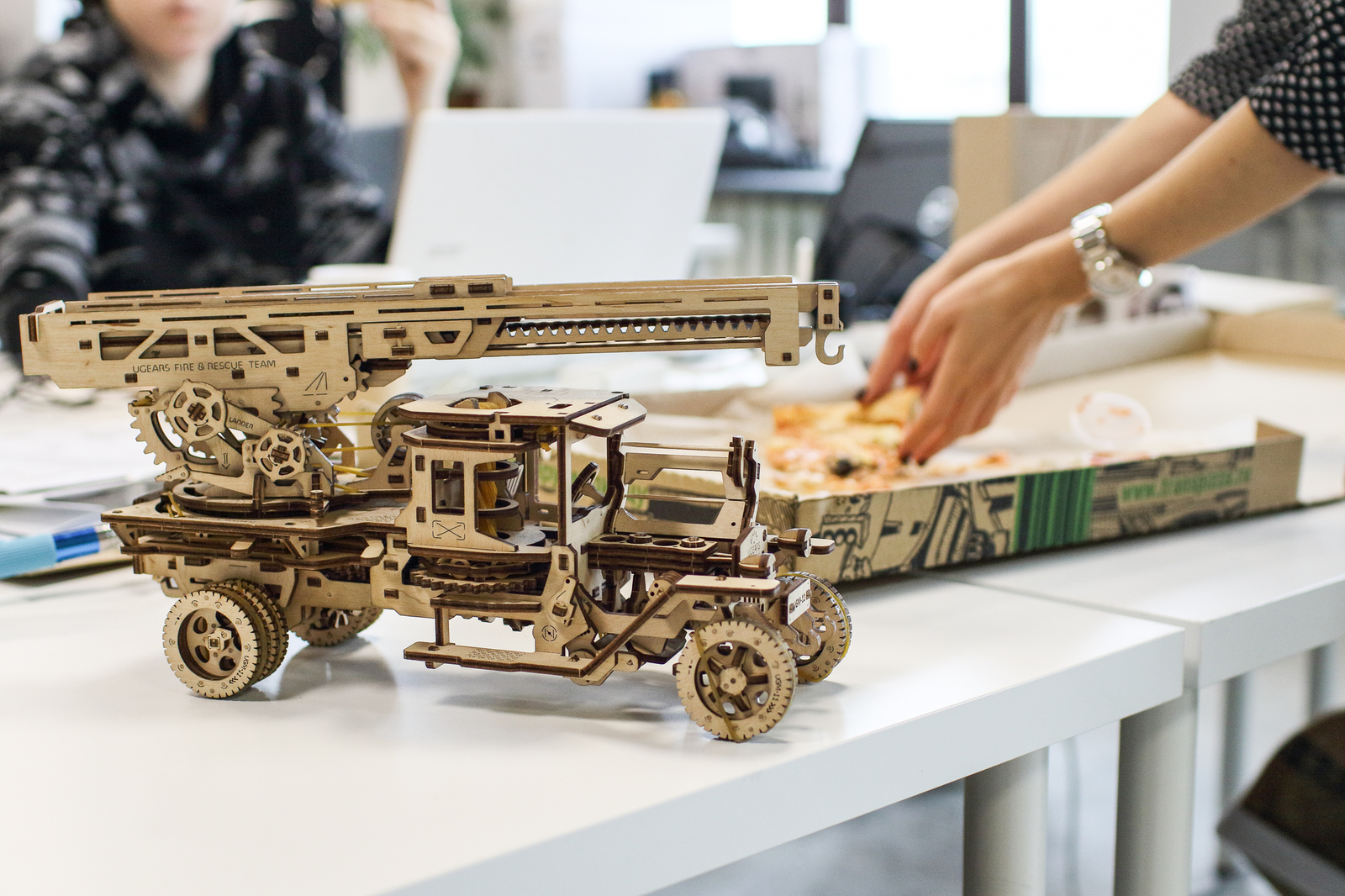 В зависимости от модели количество деталей в каждом наборе разное. В локомотиве, например 443 детали, в сейфе — 179, а в маленьких трибиках всего 25. И при создании каждой детали точность стоит на первом месте. Сейчас из цельного листа фанеры детали по чертежам вырезает лазер толщиной с человеческий волос, сегодня в цеху UGEARS стоит сразу 16 таких. В конце 2015, чтобы наладить быстрое и экономичное производство, Денис запустил кампанию на Kickstarter.