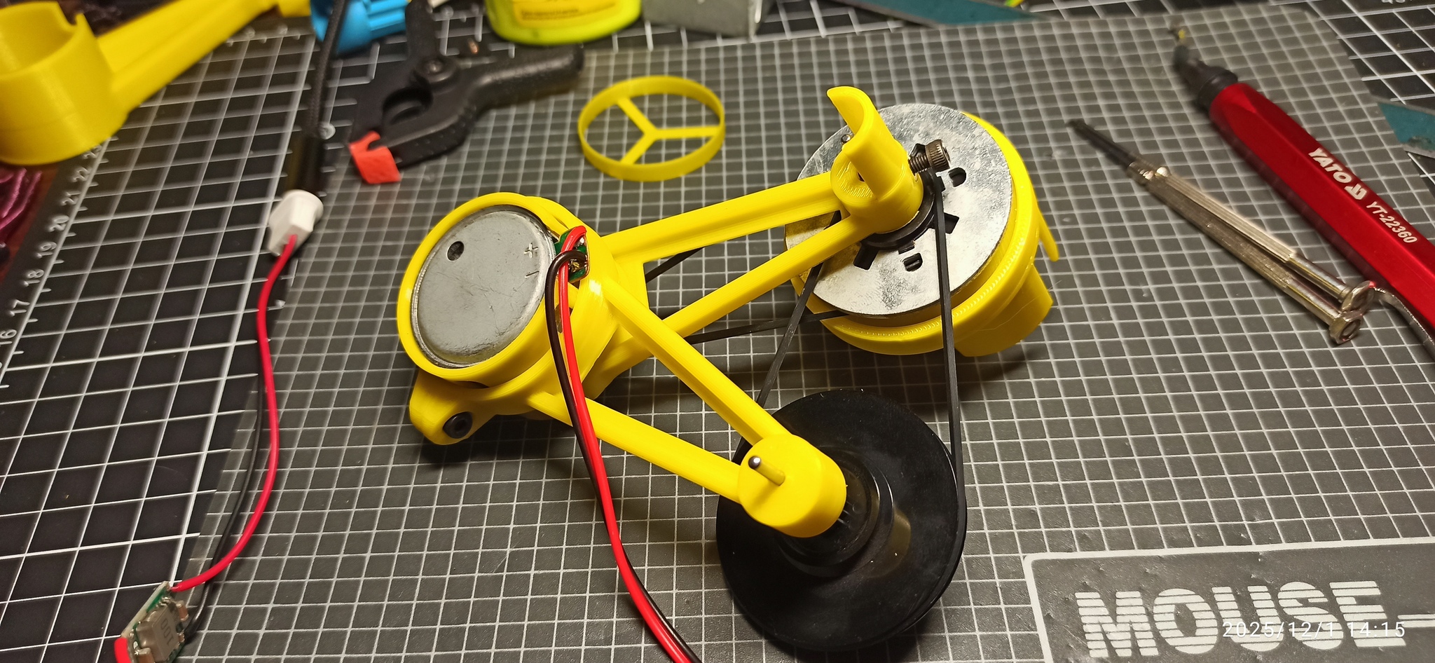 Хм.... А почему бы мне не сделать устройство 2 в 1? Чтобы была и мешалочка и столик?.... Берём второй шкиф и еще один пассик.... И продолжаем пытаться понизить обороты посредством второй понижайки. Нда... Как-то так.