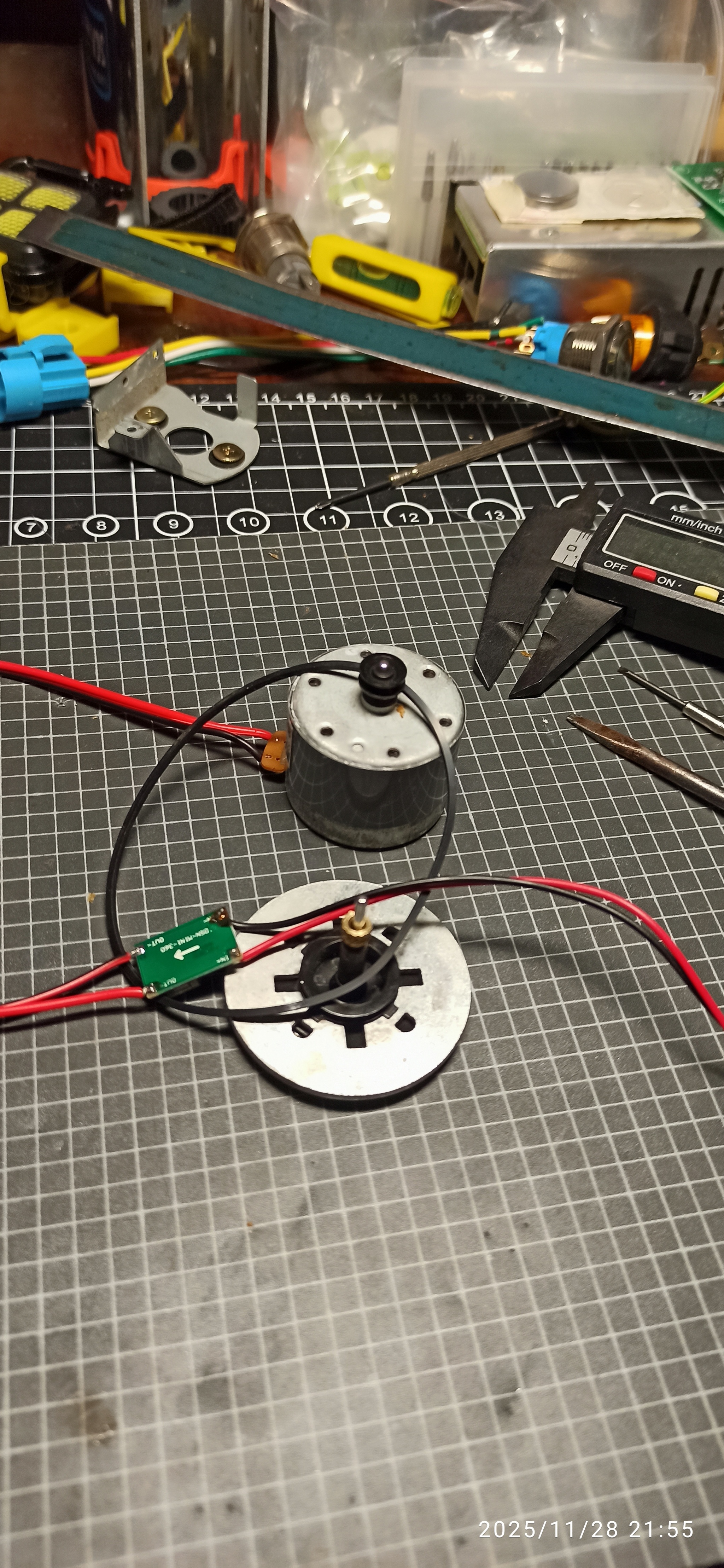 Включил... Иии.... понял, что "понижающая передача" абсолютно недостаточна. Диск крутится очень быстро. Мне нужно было один оборот в минуту, а тут их 30-50. Пониажаю напряжение, но мотор перестает крутиться совсем. Тьфу... Ладно... Не бросать же начатое. Тем более, у меня засох в бутылочке ПВА. Сурово так засох.