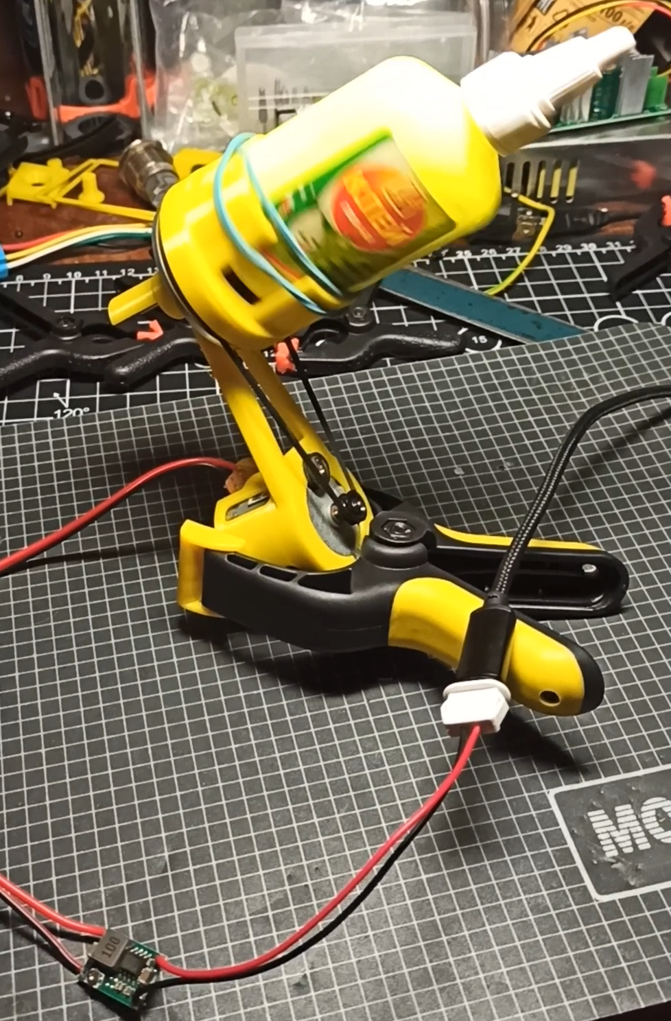 Покупать свежий лень, да и всё равно он снова засохнет... Долью водички и размешаю. Модифицирую свой "столик". Моделю и печатаю держалку бутылки. И приклеиваю к шкиву.
