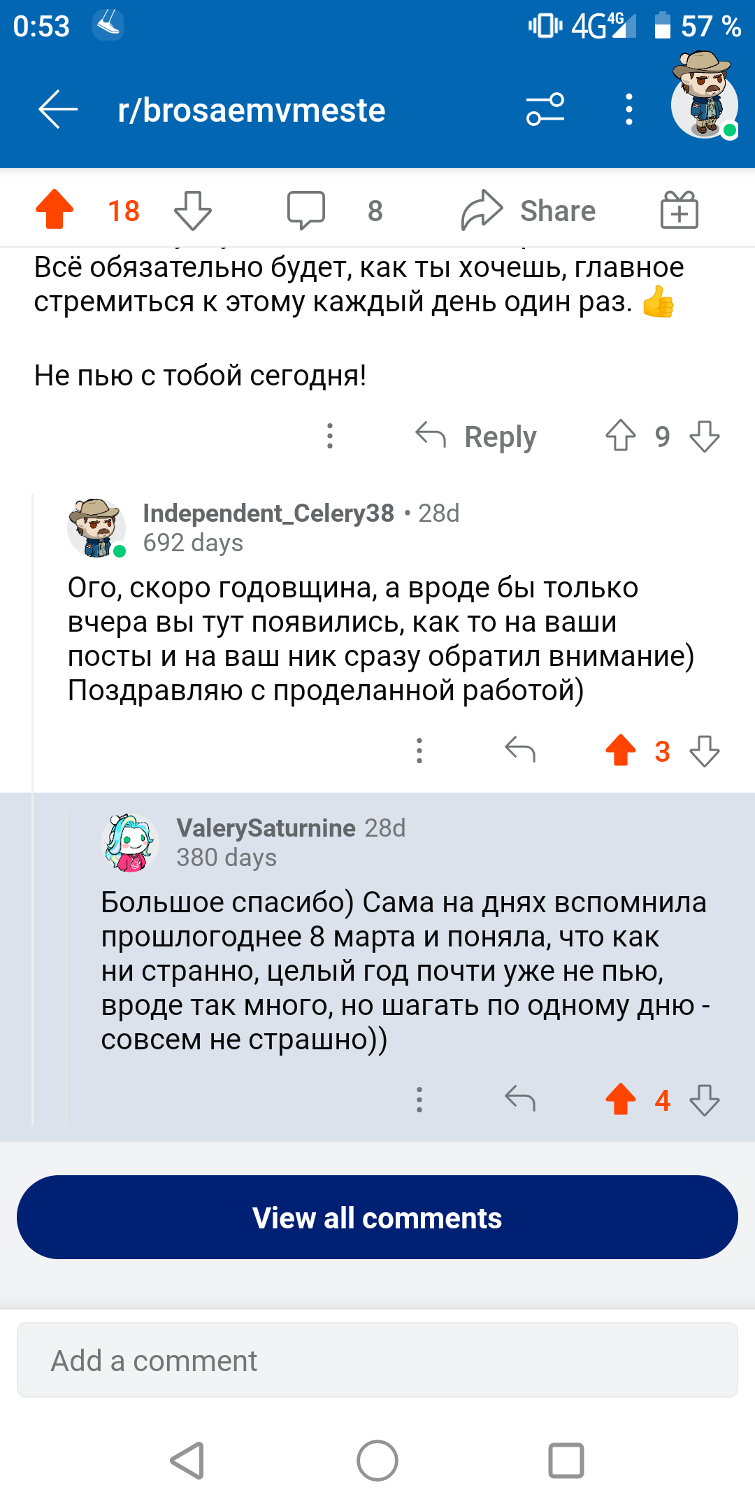 Посты от бросивших пить также заставляли задуматься, что же я делаю со своей жизнью. Мне кажется, я прочитала каждую историю, спасибо вам. Именно благодаря вам я приняла решение бросить пить.