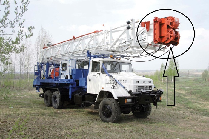 На подъемнике имеется телескопическая двухсекционная мачта. Основа любого подъемника – это буровая лебедка. Через талевую (полиспастовую) систему вращающее движение лебедки преобразует в поступательное.